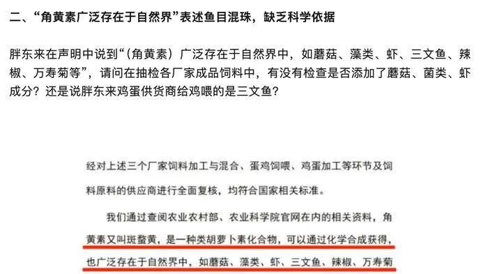 王海团队对此提出疑问:如果强调天然来源,胖东来能否在抽检的厂家饲料中找到添加蘑菇或三文鱼的证据?另外,万寿菊和辣椒提取物本身并不含角黄素,用“自然界存在”来为工业饲料中的人工合成添加剂背书,在科学上站不住脚。打假团队还提到,同为涉事品牌的德青源此前已明确承认了添加事实,而作为强调专业选品的商超,胖东来却依然试图用天然物种来混淆概念。