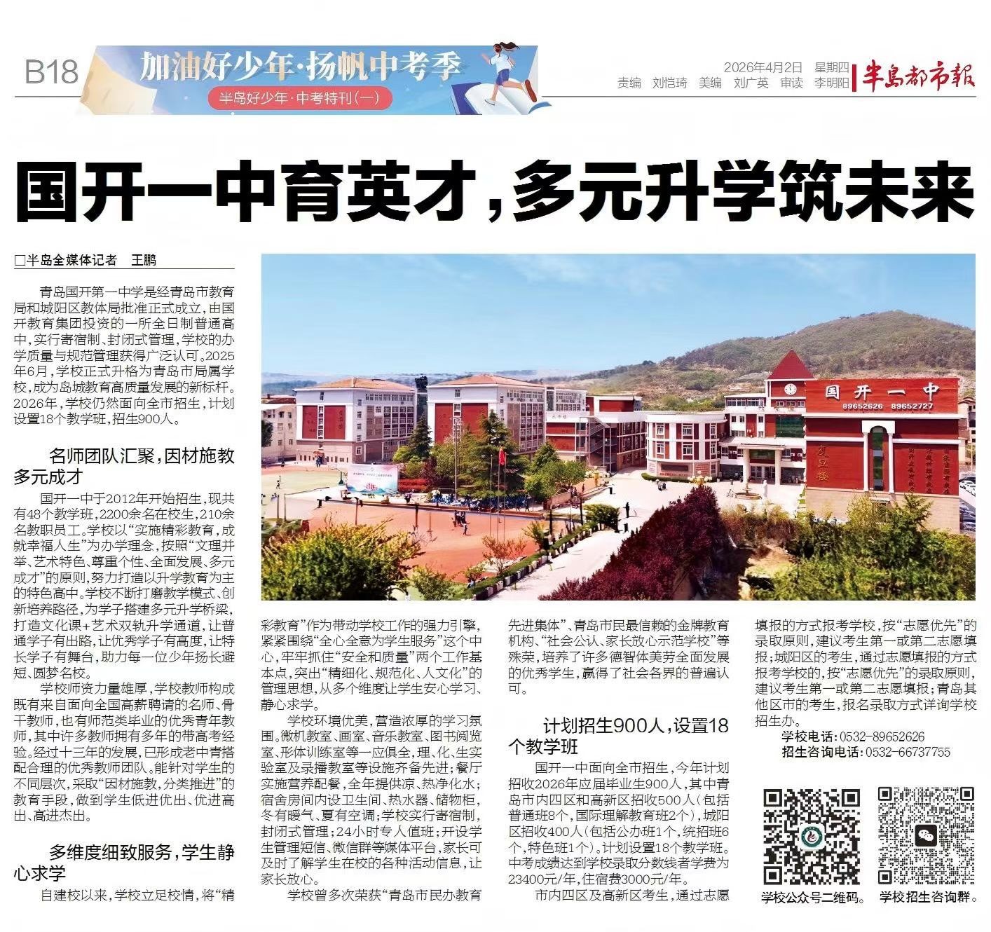 青岛国开第一中学是经青岛市教育局和城阳区教体局批准正式成立,由国开教育集团投资的一所全日制普通高中,实行寄宿制、封闭式管理,学校的办学质量与规范管理获得广泛认可。2025年6月,学校正式升格为青岛市局属学校,成为岛城教育高质量发展的新标杆。2026年,学校仍然面向全市招生,计划设置18个教学班,招生900人。