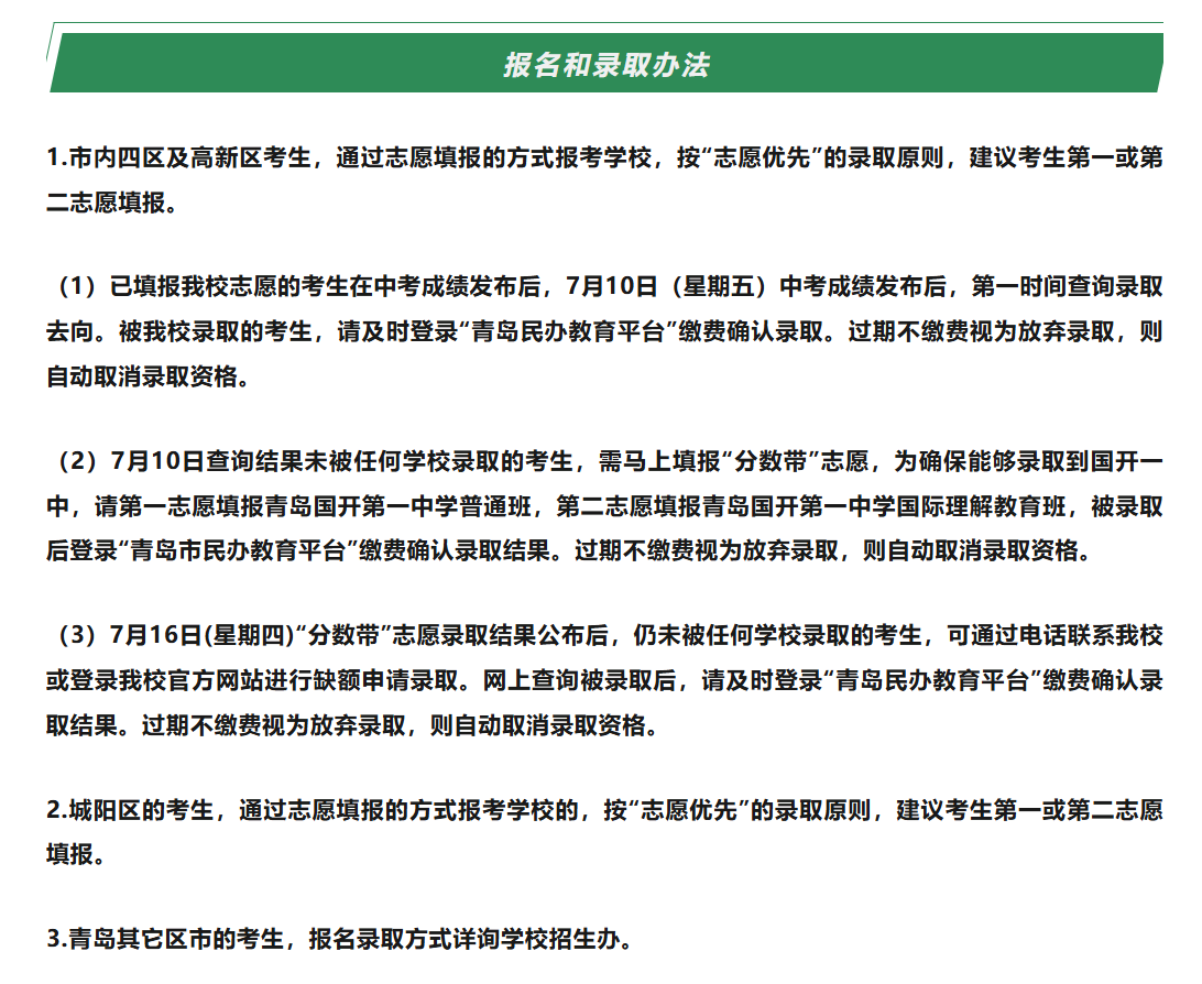 市内四区及高新区考生,通过志愿填报的方式报考学校,按“志愿优先”的录取原则,建议考生第一或第二志愿填报;城阳区的考生,通过志愿填报的方式报考学校的,按“志愿优先”的录取原则,建议考生第一或第二志愿填报;青岛其他区市的考生,报名录取方式详询学校招生办。