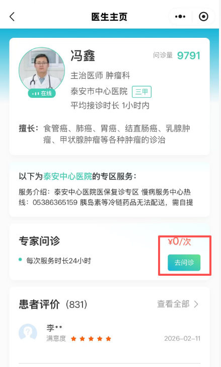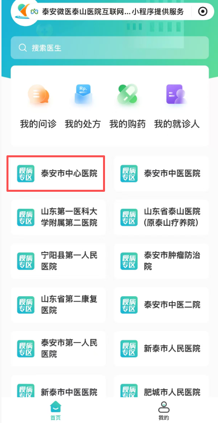 ③选择“泰安市中心医院”—上方搜索处搜索医生,点击“去问诊”。