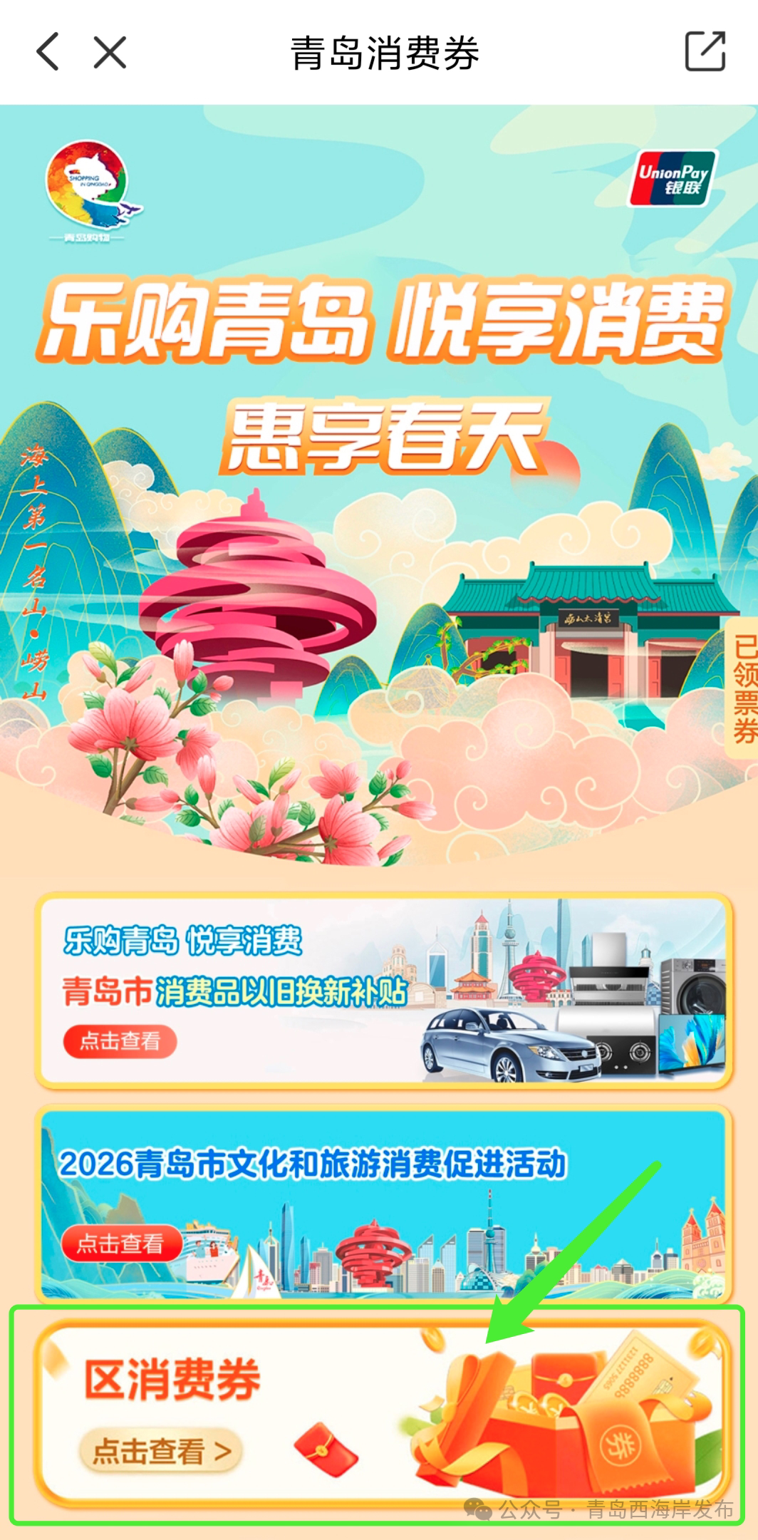 3.活动期间,每日登录“云闪付”APP,进入“青岛消费券”-“区消费券”-“西海岸新区”活动专区,即可抢券,单日三种券合计限领1张,数量有限,领完为止,活动期间单用户限核销三张优惠券;