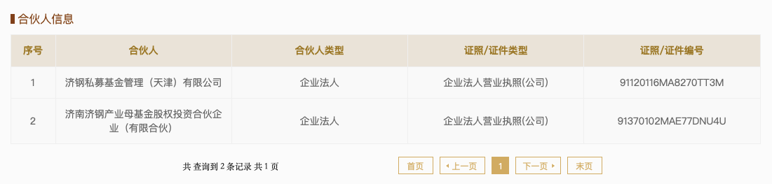 济钢星通的合伙人信息显示,济南济钢产业母基金股权投资合伙企业(有限合伙)(下称“济钢母基金”)认缴出资额1.068亿元,出资比例98.8889%;济钢私募基金管理(天津)有限公司(下称“济钢基金”)出资额120万元,出资比例为1.1111%。