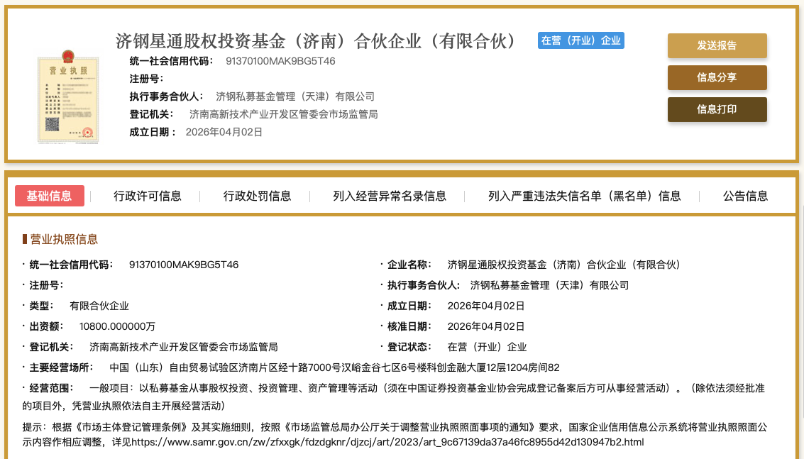 国家企业信用信息公示系统显示,近日,济钢星通股权投资基金(济南)合伙企业(有限合伙)(下称“济钢星通”)注册成立,出资额约1.08亿元,经营范围包含以私募基金从事股权投资、投资管理、资产管理等。