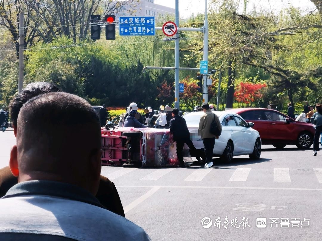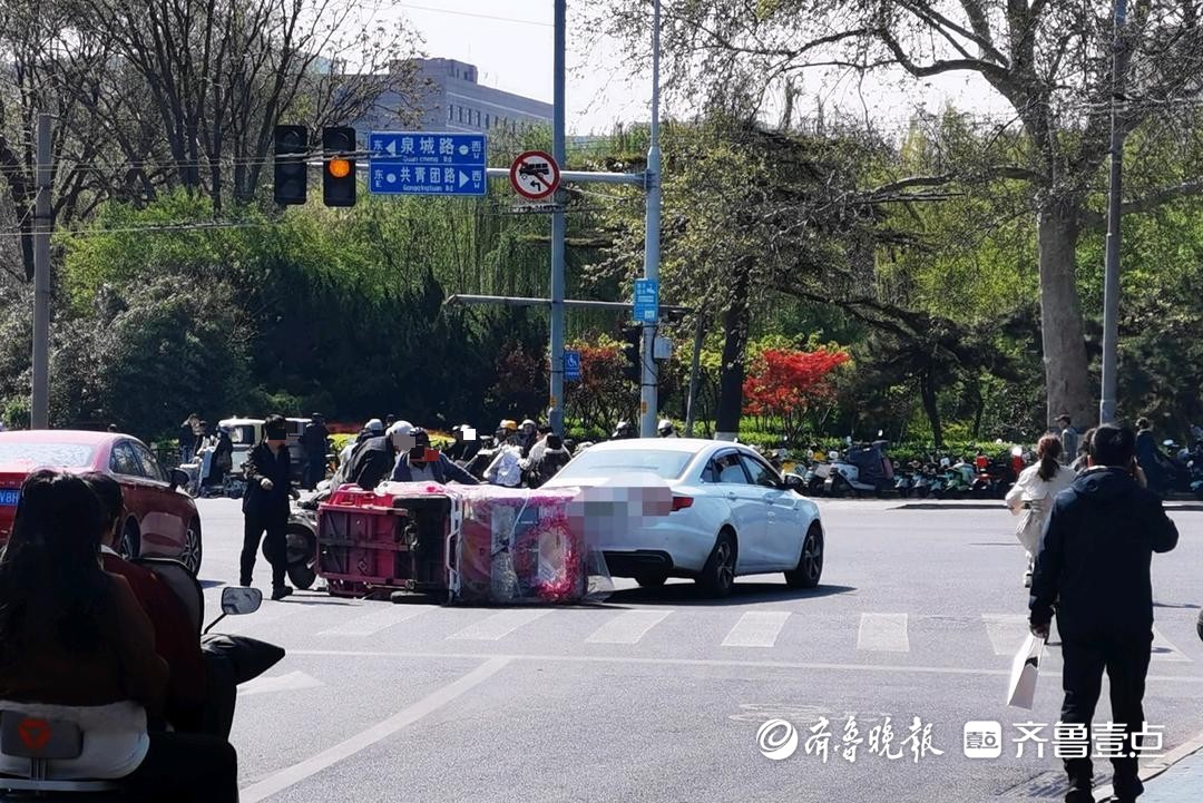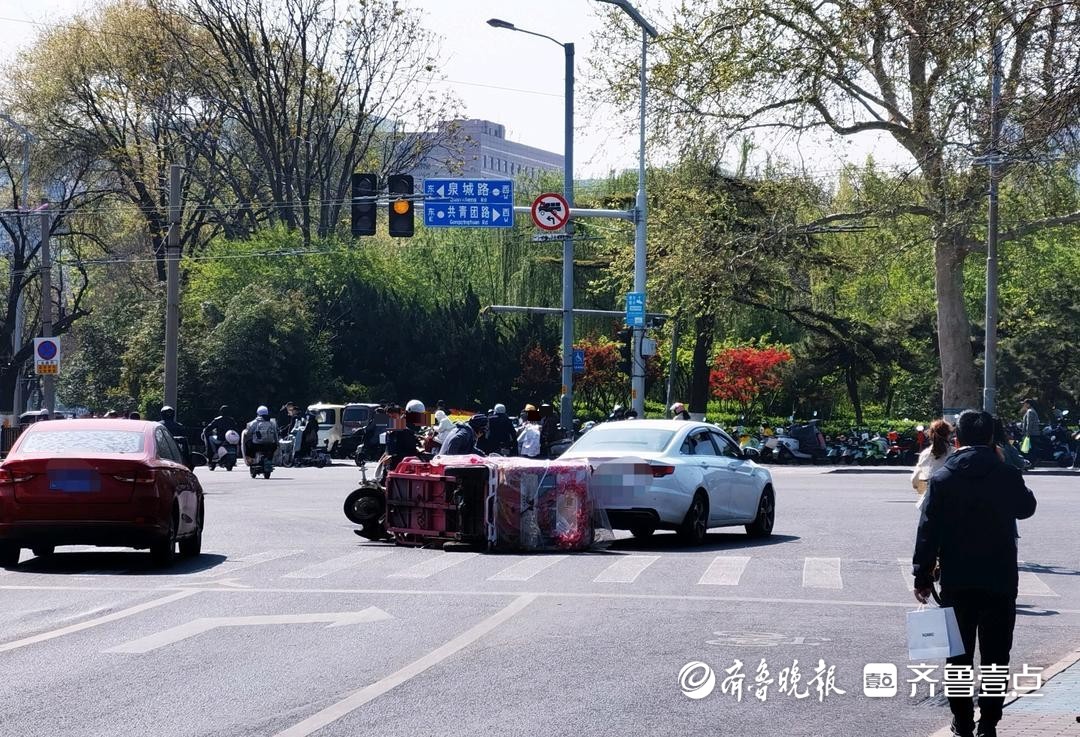 情报站|济南泉城路与共青团路路口两车相撞,电动三轮车侧翻倒地