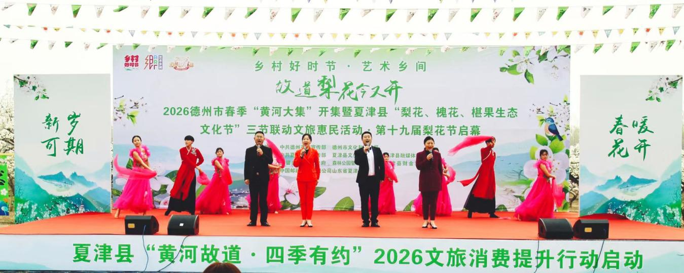 春风拂沃野,梨雪满枝头。近日,伴着黄河故道香雪园千树梨花的芬芳,2026德州市春季黄河大集在夏津正式开集,同步开启夏津县“梨花、槐花、椹果生态文化节”文旅惠民活动,让春日市集的烟火气与梨园美景相融,为市民游客带来一场集民俗体验、非遗展示、农品展销于一体的文旅盛宴。