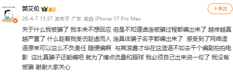 郭艾伦发文否认被骗近千万:我没有被骗,网络造谣原来可以这么不负责任