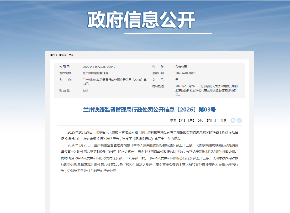 近日,兰州铁路监督管理局发布行政处罚公开信息〔2026〕第03号,2025年10月29日,北京智讯天成技术有限公司和北京巨道科技有限公司在兰州铁路监督管理局辖区的铁路工程建设项目招投标活动中,存在串通投标的违法行为,违反了《招标投标法》第三十二条的规定。