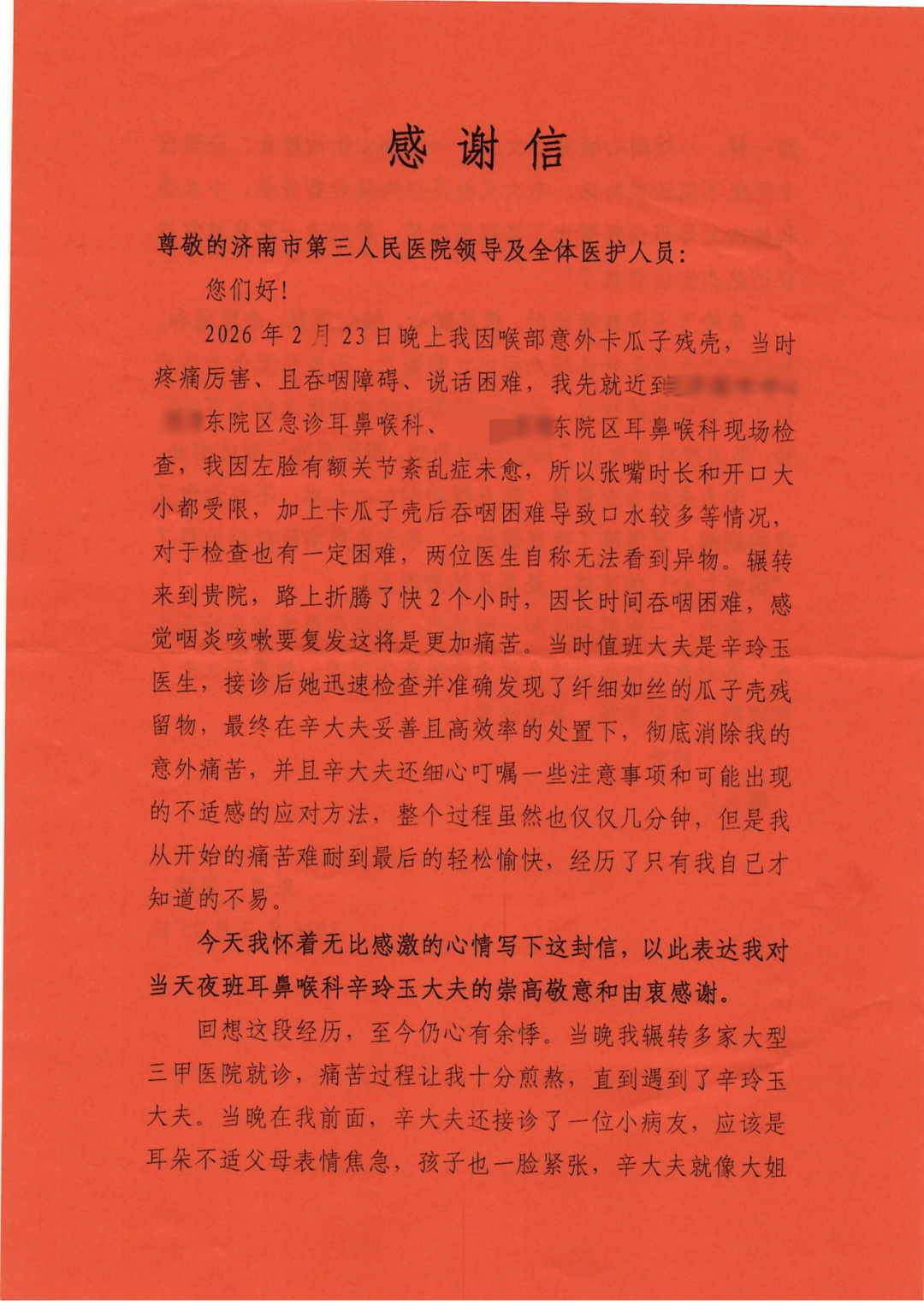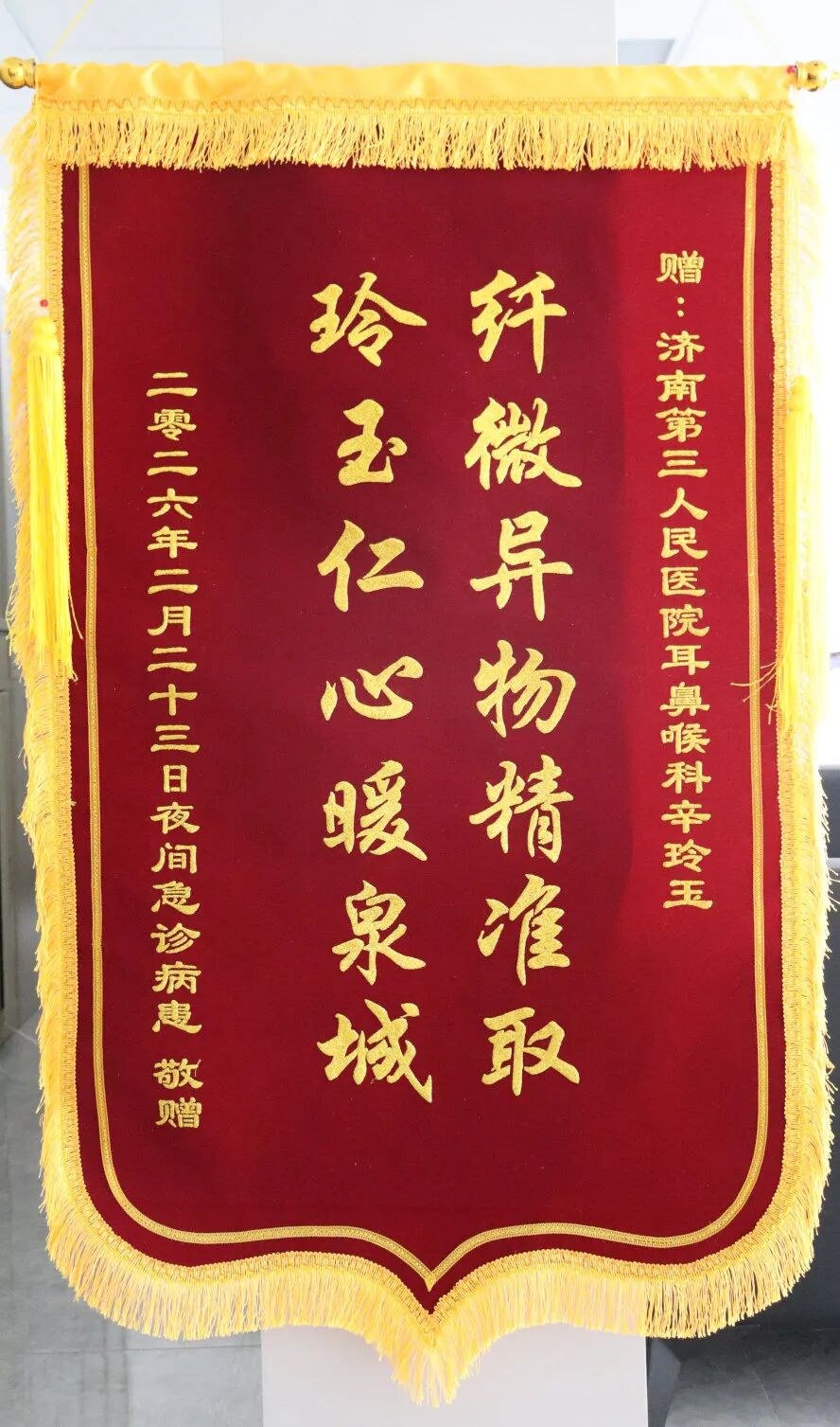 “整个就诊过程只有几分钟,但带给我的感动是无法言表的。”近日,患者刘先生(化名)专程将一面锦旗送到济南市第三人民医院,感谢耳鼻喉科值班医生辛玲玉的及时救治和暖心关怀。