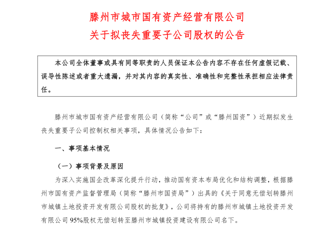滕州国资公司拟无偿划转滕州土地投资95%股权,涉及净资产超4亿