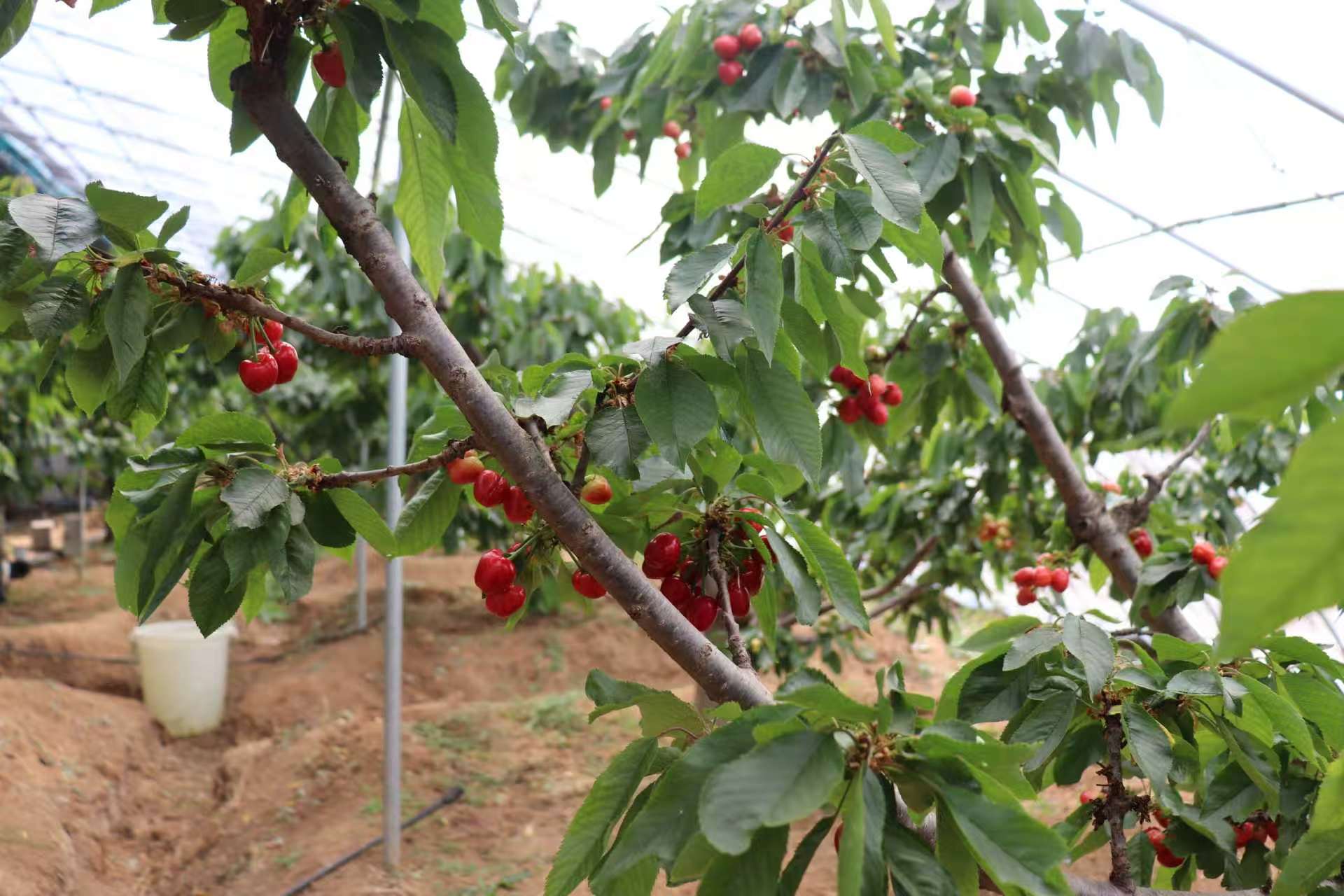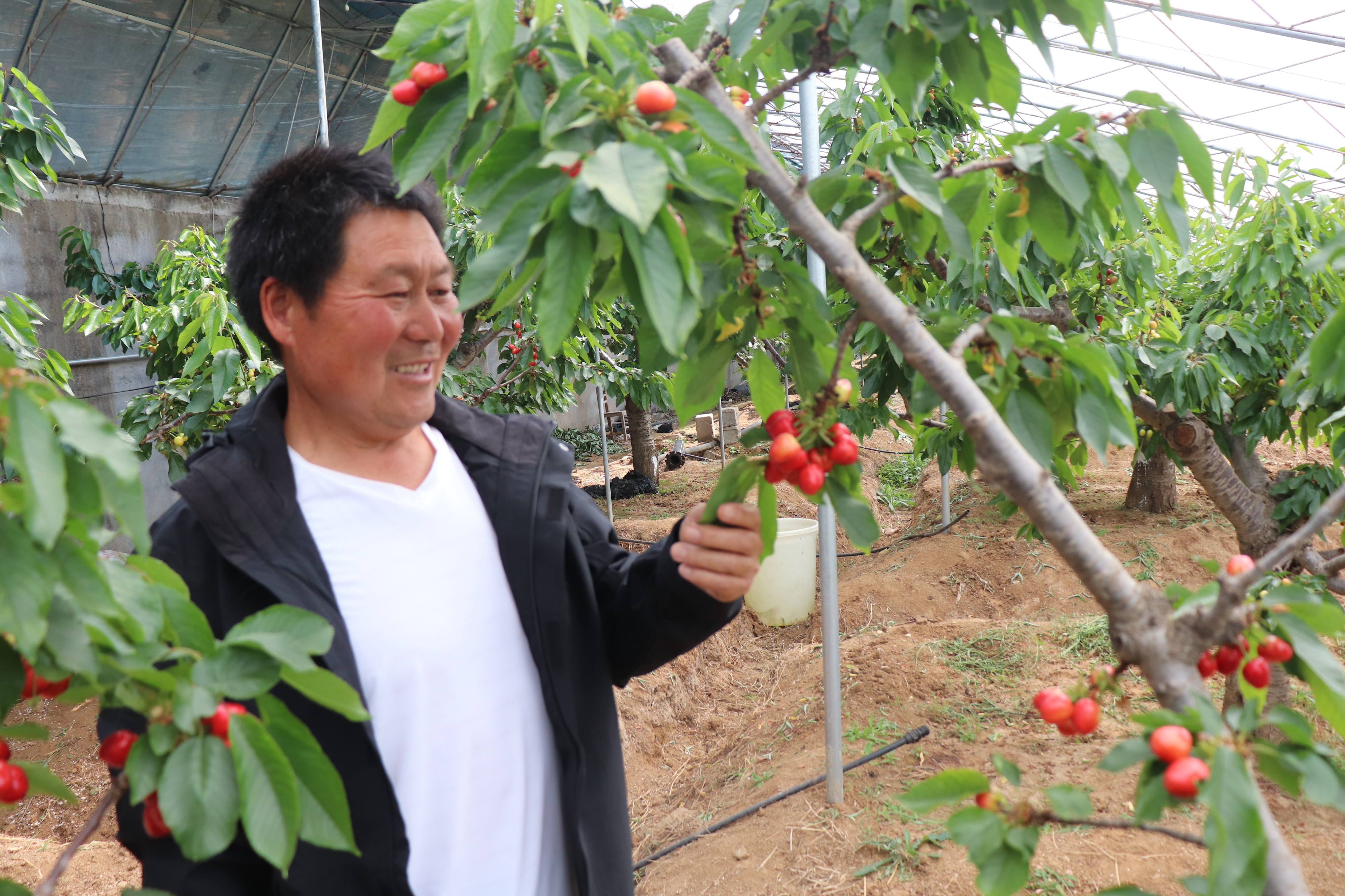4月3日,平邑县临涧镇果农朱西义看着自己在前马槽村种植的大棚大樱桃,露出喜悦的笑容。朱西义种植的4个大棚大樱桃,总计8亩。由于精细管理,该优质大樱桃个头大,品质好,上市早,上市可卖到至少60元每公斤。