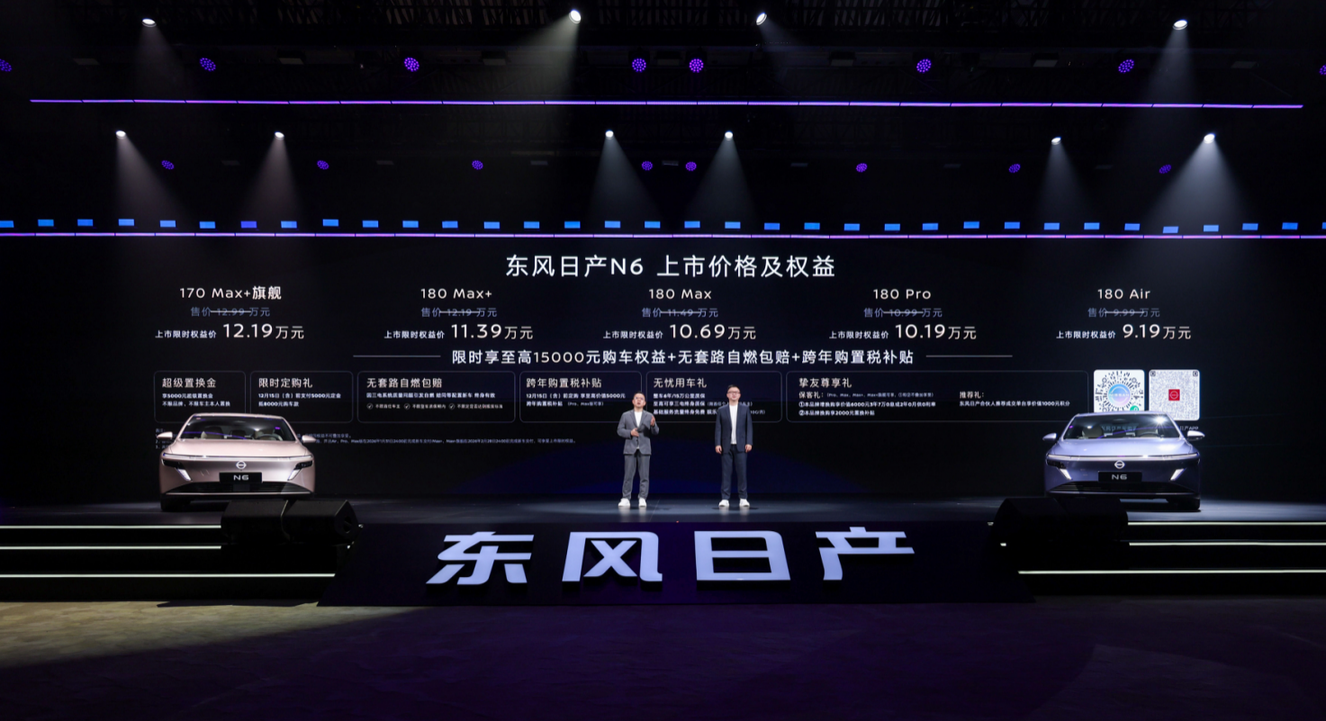 2026齐鲁车展4月10-12日东风日产重磅参展,东风日产天演架构下的首款插混车型——东风日产N6。新车定位“大电池超舒适中高级插混轿车”,凭借王牌产品硬实力、越级智能软实力、央企合资高品质三大核心优势,重新定义插混轿车新标准。此次,东风日产N6推出了180Air、180Pro、180Max、180Max+、170Max+旗舰共5个版本,售价区间为9.99-12.99万元。