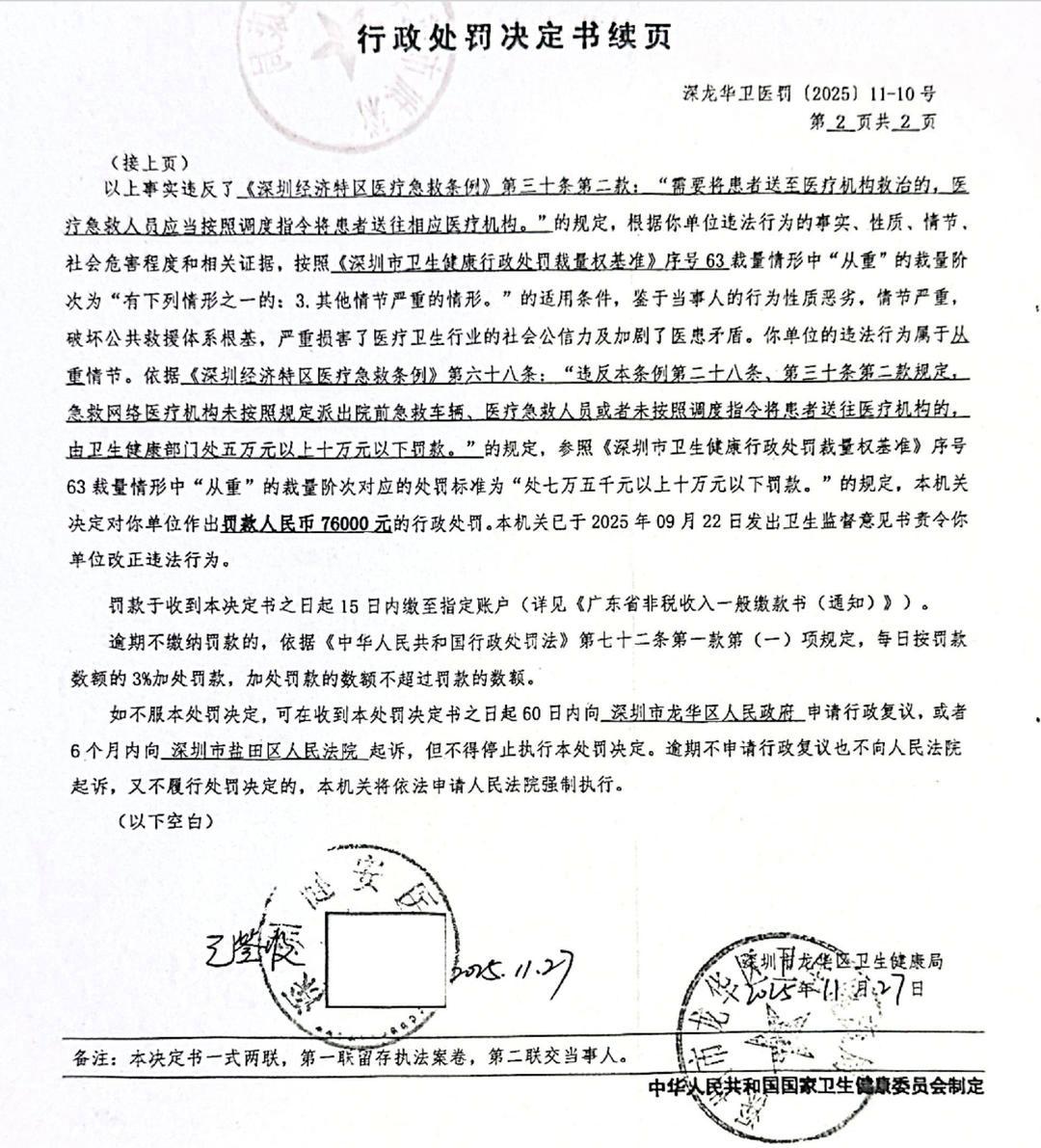 红星新闻记者获悉,3个多月后,涉事深圳市健安医院因违反深圳市急救条例受到了处罚。据信用中国网站,深圳市龙华区卫生健康局2025年11月27日发布的行政处罚决定书查明,“深圳健安医院在2025年8月5日转运患者张某某时,未按医疗急救调度指令将患者转运至相应的龙华区人民医院救治。”