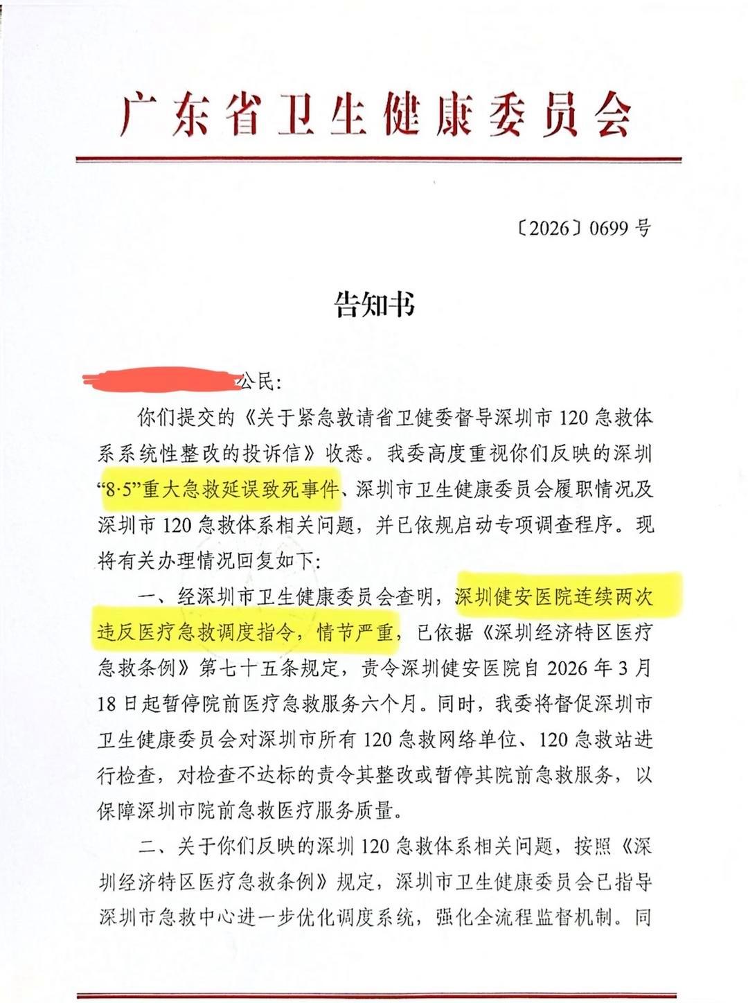 函件提到,经深圳市卫健委查明,深圳健安医院连续两次违反医疗急救调度指令,情节严重已依据《深圳经济特区医疗急救条例》第七十五条规定,责令深圳健安医院自2026年3月18日起暂停院前医疗急救服务六个月。“同时,我委将督促深圳市卫健委会对深圳市所有120急救网络单位、120急救站进行检查,对检查不达标的责令其整改或暂停其院前急救服务,以保障深圳市院前急救医疗服务质量。”