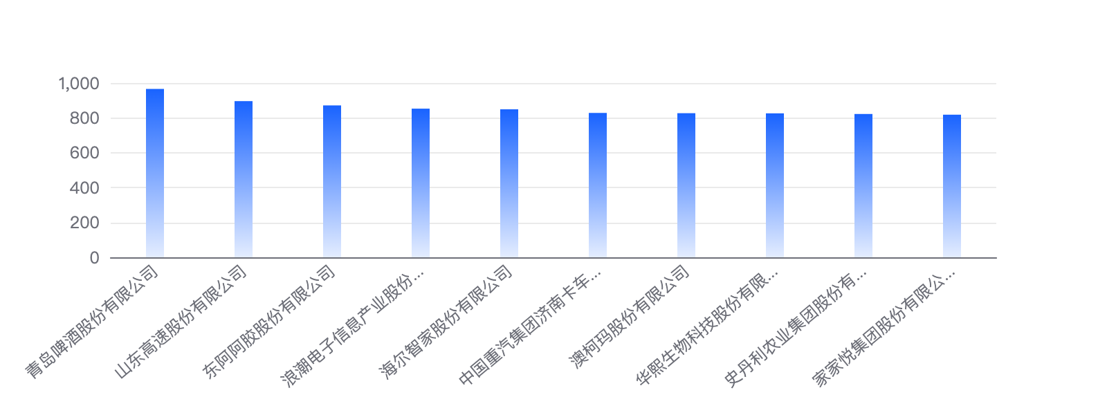 位居排行榜前十的分别是青岛啤酒股份有限公司、山东高速股份有限公司、东阿阿胶股份有限公司、浪潮电子信息产业股份有限公司、海尔智家股份有限公司、中国重汽集团济南卡车股份有限公司、澳柯玛股份有限公司、华熙生物科技股份有限公司、史丹利农业集团股份有限公司、家家悦集团股份有限公司,其中排名上涨最多的是澳柯玛股份有限公司,提升2名。上个月排名前十的品牌本月下降最多的是东阿阿胶股份有限公司,下降2名。