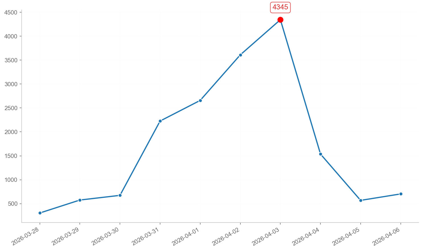 如图所示,有关活动的信息传播于4月3日达到最高活跃峰值,当天信息传播数量为4345条,占全部信息总量的25.28%。