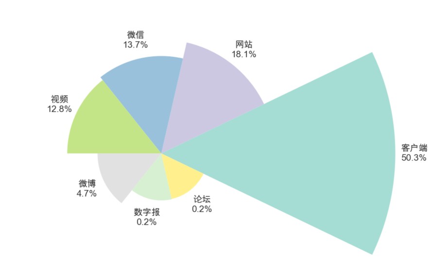 全网17189条传播信息中,来自客户端的信息有8639条,来自网站的3119条,微博805条,微信2362条,视频2199条,数字报39条,互动论坛26条。信息传播量最大的渠道是客户端。客户端信息数量占比达50.26%,说明主流媒体在第十四届储能国际峰会暨展览会的信息传播中起到了重要的推动作用。