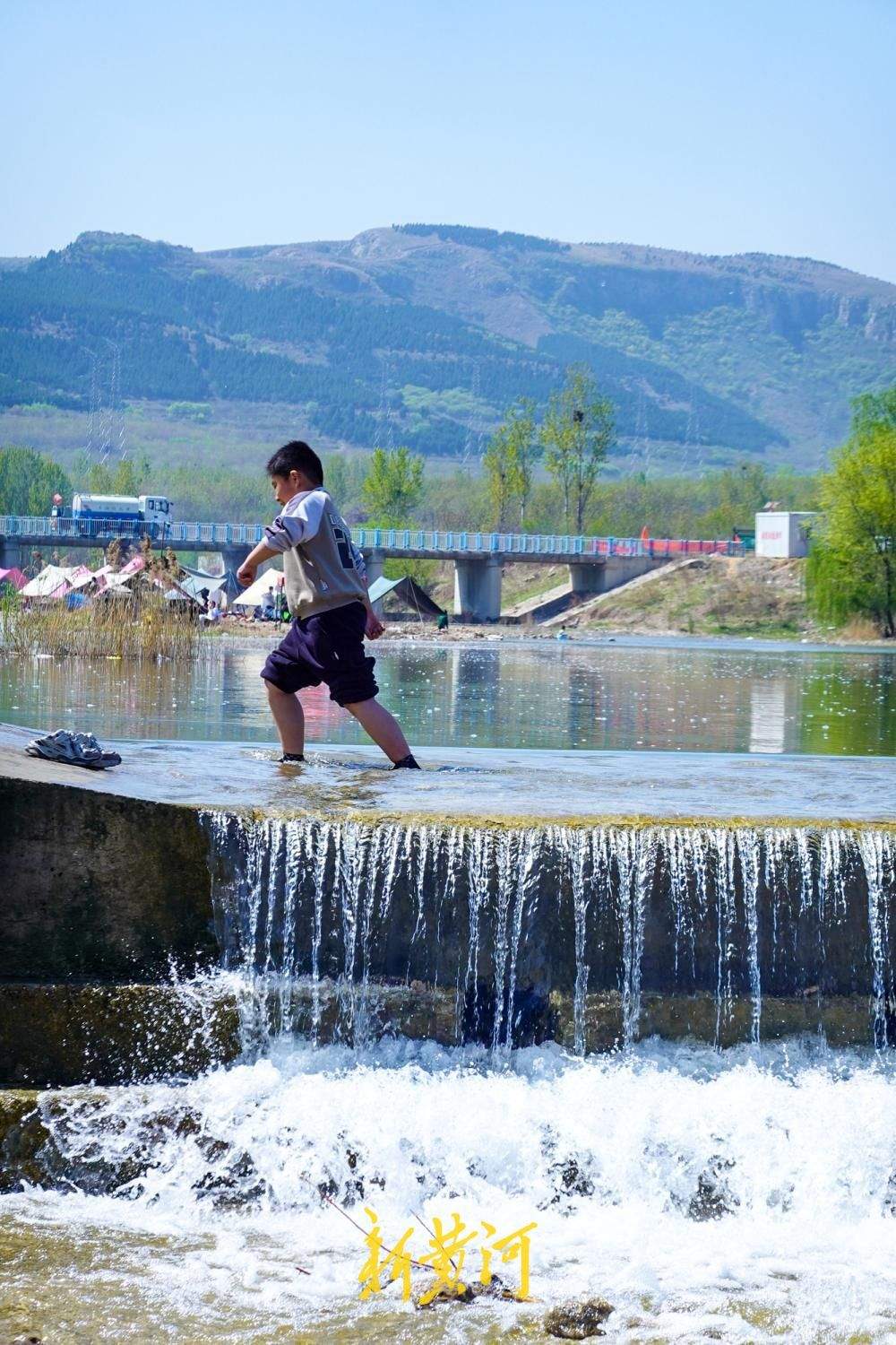 玉符河下游河道水质清澈,水流舒缓,浅滩处水深仅及脚踝。与海边“赶海”不同,玉符河的“淡水赶海”主打亲水与野趣。市民无需等待退潮,只要找一处浅滩,就能享受捞鱼摸虾的乐趣。不少游客还在岸边铺上野餐垫,玩累了就坐下来吃吃喝喝,享受春日暖阳与清凉河水交织的惬意时光。