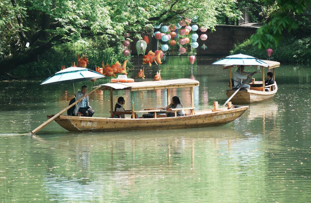 5일 관광객들이 저장(浙江)성 항저우(杭州)시 시시(西溪)국가습지공원에서 배를 타며 즐거운 시간을 보내고 있다. 2026.4.6