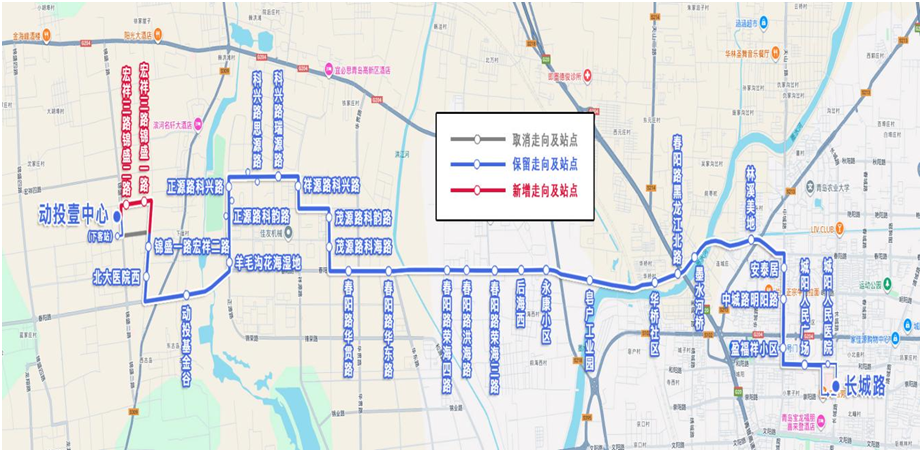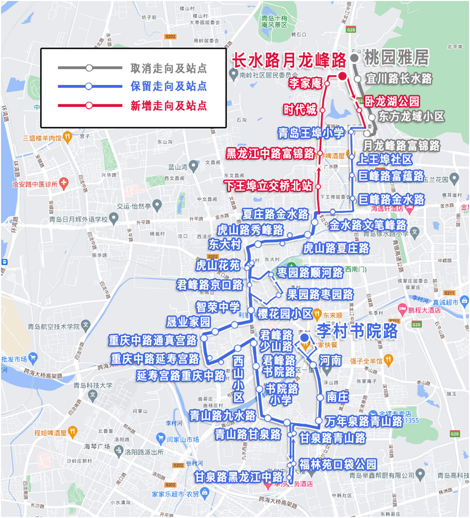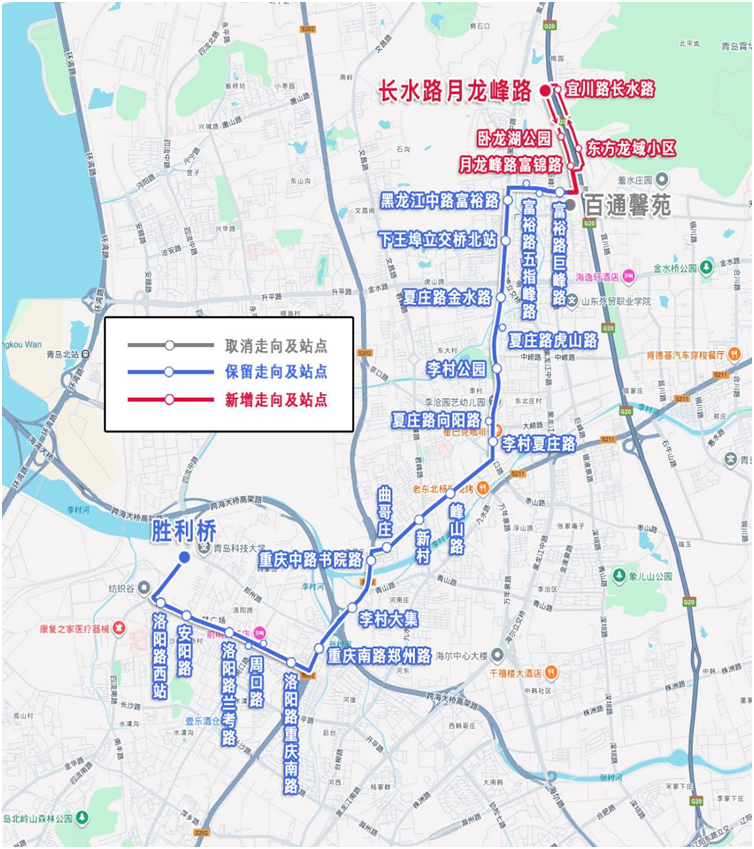 取消站:桃园雅居(双向)、宜川路长水路(双向)、东方龙域小区(双向)、月龙峰路富锦路(双向)、青岛王埠小学(仅上行)、上王埠社区(仅上行)、巨峰路富蕴路(仅上行)、巨峰路金水路(仅上行)、金水路文笔峰路(仅上行)。