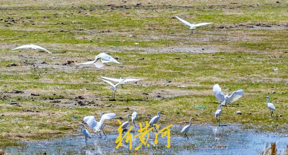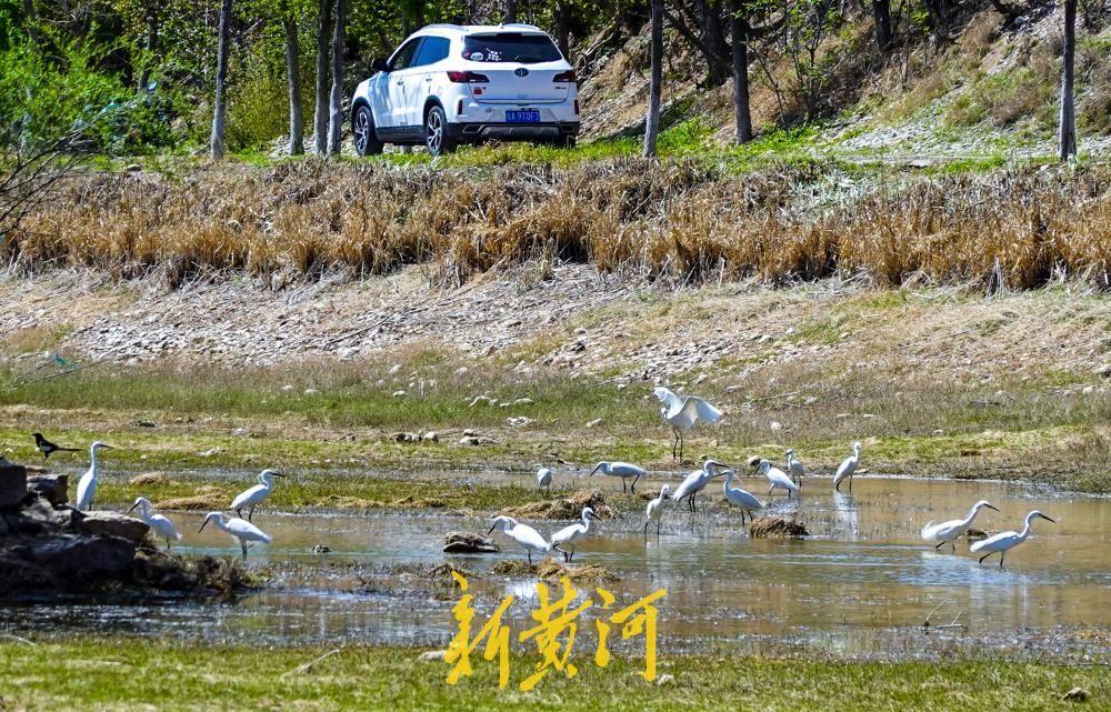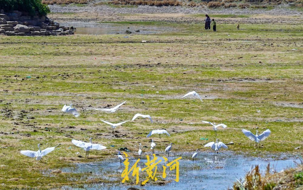 4月6日,在齐兴大街东侧的玉符河河段,尽管目前河道处于断流阶段,但多个河段仍形成了大片的浅水水域。河道内水生植物生长茂盛,俨然一片生机盎然的湿地环境。良好的生态条件吸引了数十只鹭鸟飞至此地,它们或在河面上飞翔嬉戏,或以河水中的鱼儿为食,玉符河已成为鹭鸟的栖息乐园。