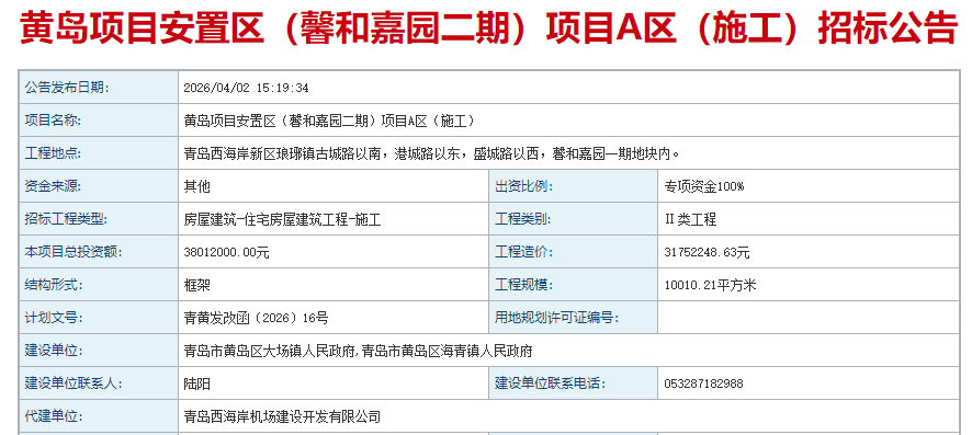 近日,黄岛项目安置区(馨和嘉园二期)项目A区(施工)招标公告发布,工程地点位于西海岸新区琅琊镇古城路以南,港城路以东,盛城路以西,馨和嘉园一期地块内,建设单位为青岛市黄岛区大场镇人民政府、青岛市黄岛区海青镇人民政府,代建单位为青岛西海岸机场建设开发有限公司。