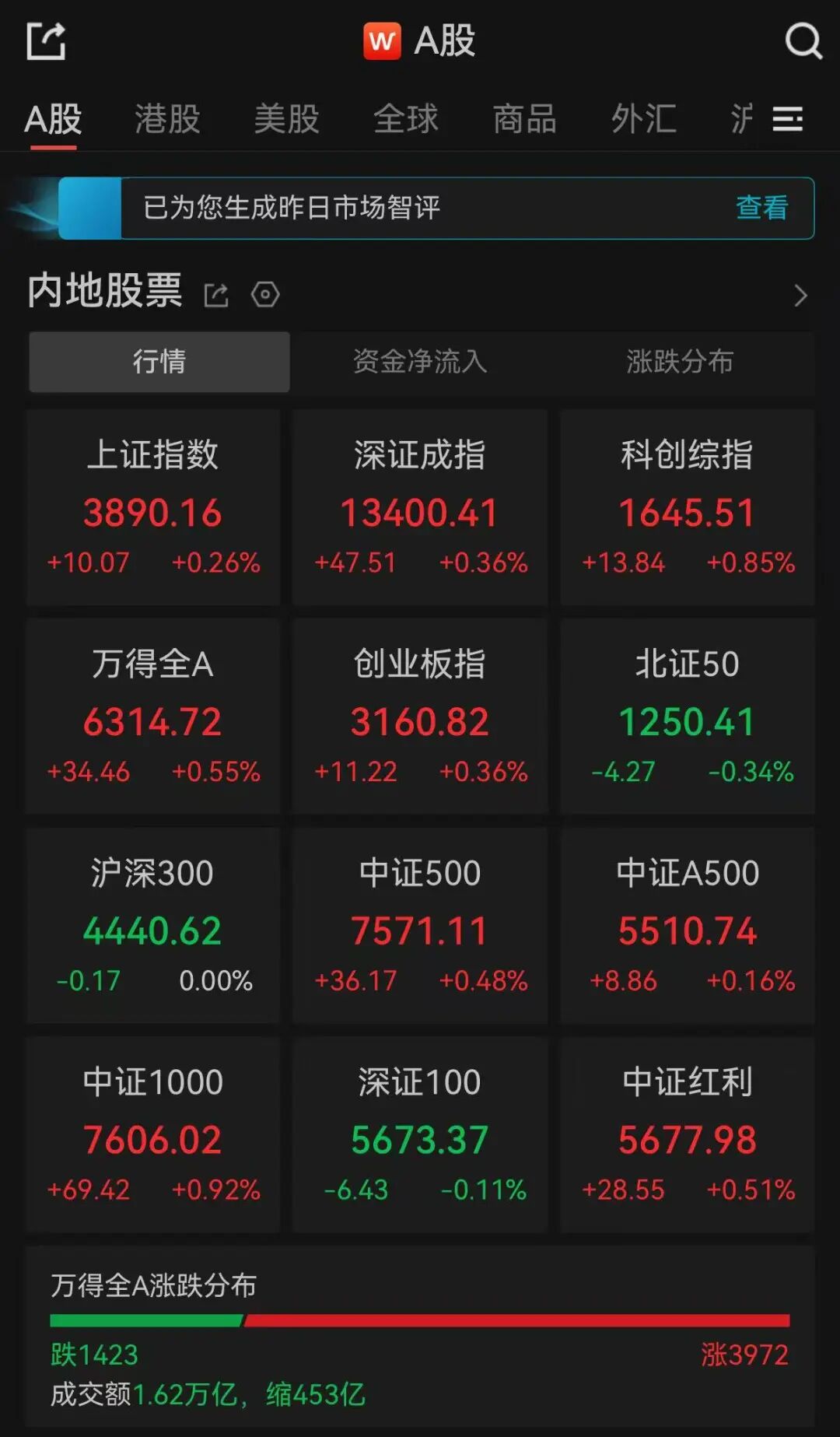 7日,A股三大指数高开,午后一度集体翻绿,随后探底回升集体收涨。Wind数据显示,截至收盘,上证指数涨0.26%,深证成指涨0.36%,创业板指涨0.36%。全市成交额1.62万亿,超3900只个股上涨。板块方面,化工股掀涨停潮,大炼化、有机硅方向领涨;稀土永磁概念股午后崛起,PCB、半导体设备活跃。金融、医药板块走弱。