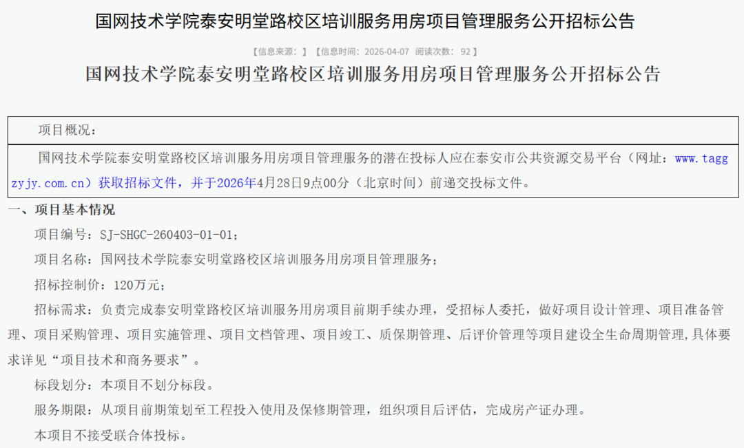 4月7日,国网技术学院泰安明堂路校区培训服务用房项目管理服务发布公开招标公告。