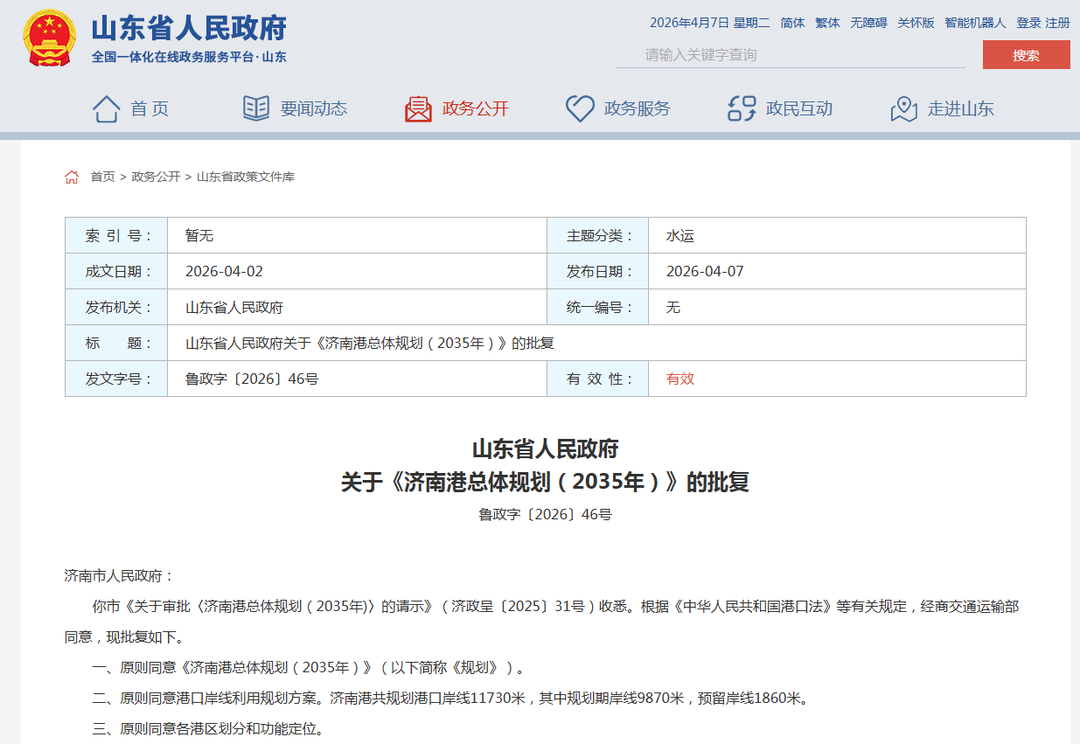 近日,山东政府网公布山东省人民政府关于《济南港总体规划(2035年)》的批复(鲁政字〔2026〕46号),原则同意《济南港总体规划(2035年)》。该规划的获批标志着济南港建设正式迈入统筹规划、高质量发展的新阶段,将为济南都市圈打造通江达海重要启运港、服务黄河流域生态保护和高质量发展提供坚实战略支撑。