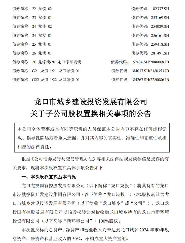 近日,龙口市城乡建设投资发展有限公司(下称“龙口城乡”)发布关于子公司股权置换相关事项的公告。公告显示,龙口龙投国有控股发展有限公司(下称“龙口龙投”)将其持有的龙口市港城投资开发建设集团有限公司(下称“龙口港投”)32%股权转让给龙口城乡,龙口龙投以该股权转让对价收购龙口城乡持有的龙口市新环境投资有限公司(下称“新环境公司”)100%股权。