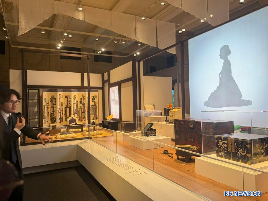 큐레이터가 '서울 시민 생활전'에서 전시 물품을 소개하고 있다. (사진/신화통신)
