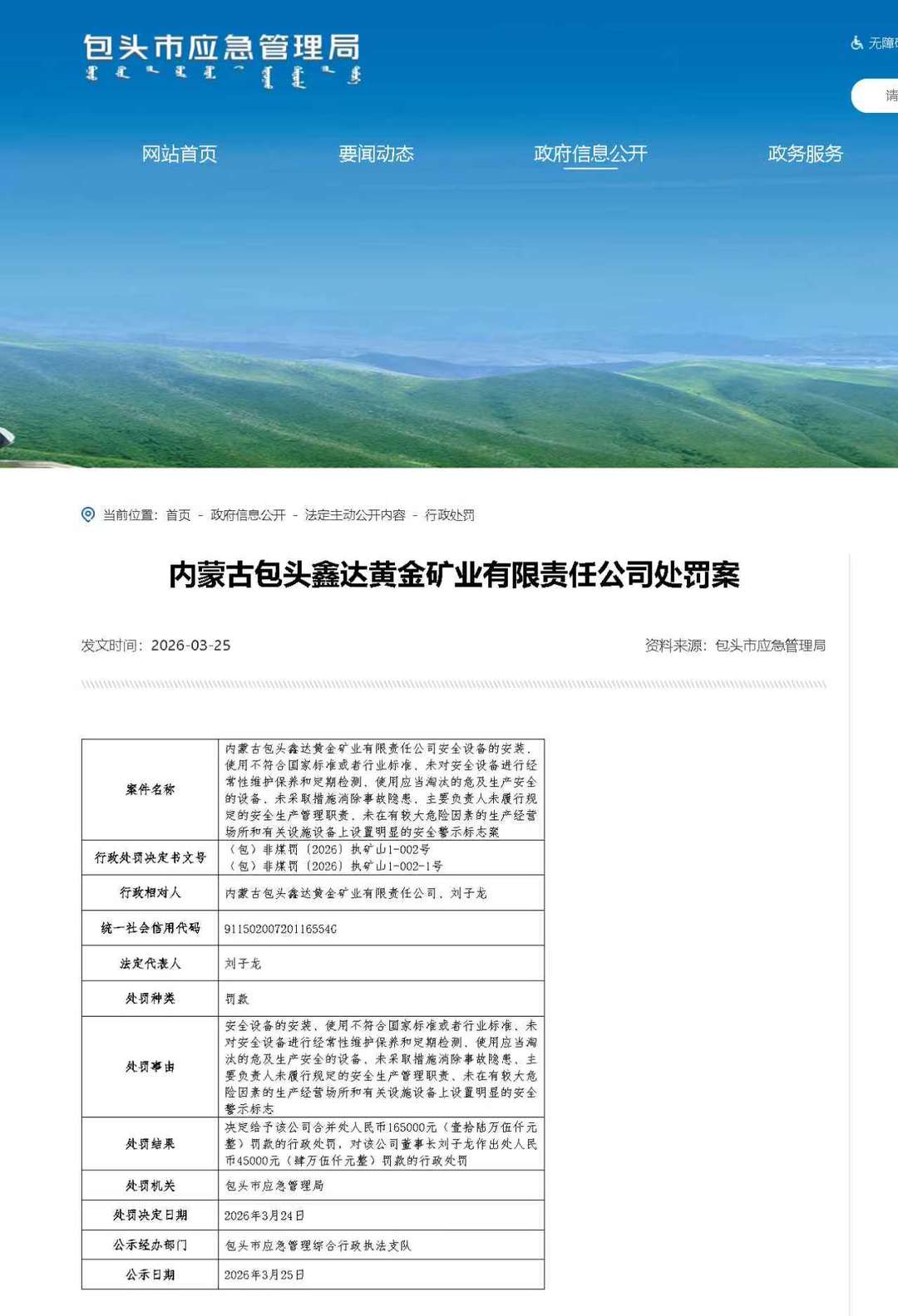 对此,包头市应急管理局决定给予包头鑫达黄金矿业合并处人民币165000元(壹拾陆万伍仟元整)罚款的行政处罚,对该公司董事长刘子龙作出处人民币45000元(肆万伍仟元整)罚款的行政处罚。行政处罚决定书文号:(包)非煤罚〔2026〕执矿山1-002号;(包)非煤罚〔2026〕执矿山1-002-1号。