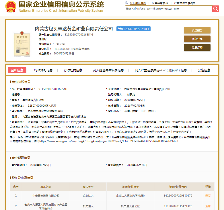 国家企业信用信息公示系统显示,内蒙古包头鑫达黄金矿业有限责任公司成立于2000年,注册资本12507万元人民币,法定代表人为刘子龙,大股东为中金黄金(600489.SH)。