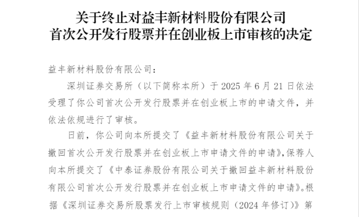 日前,益丰新材料股份有限公司(下称“益丰新材”)披露的公告显示,因公司及保荐人中泰证券申请撤回IPO材料,深交所决定终止对公司首次公开发行股票并在创业板上市的审核。此前,益丰新材IPO申请已于2025年6月21日获受理。