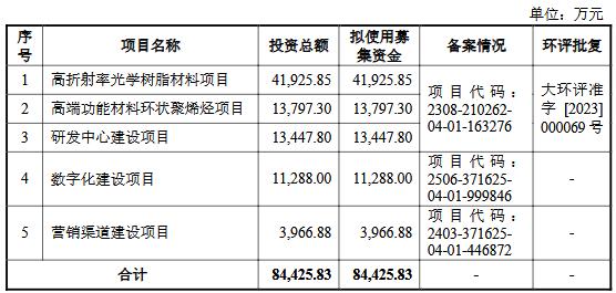 据益丰新材披露的招股书,其原拟在深交所创业板发行新股不超过4736万股,且占发行后总股本比例不低于25%,原拟募集资金8.44亿元用于高折射率光学树脂材料项目、高端功能材料环状聚烯烃项目、研发中心建设项目、数字化建设项目、营销渠道建设项目。