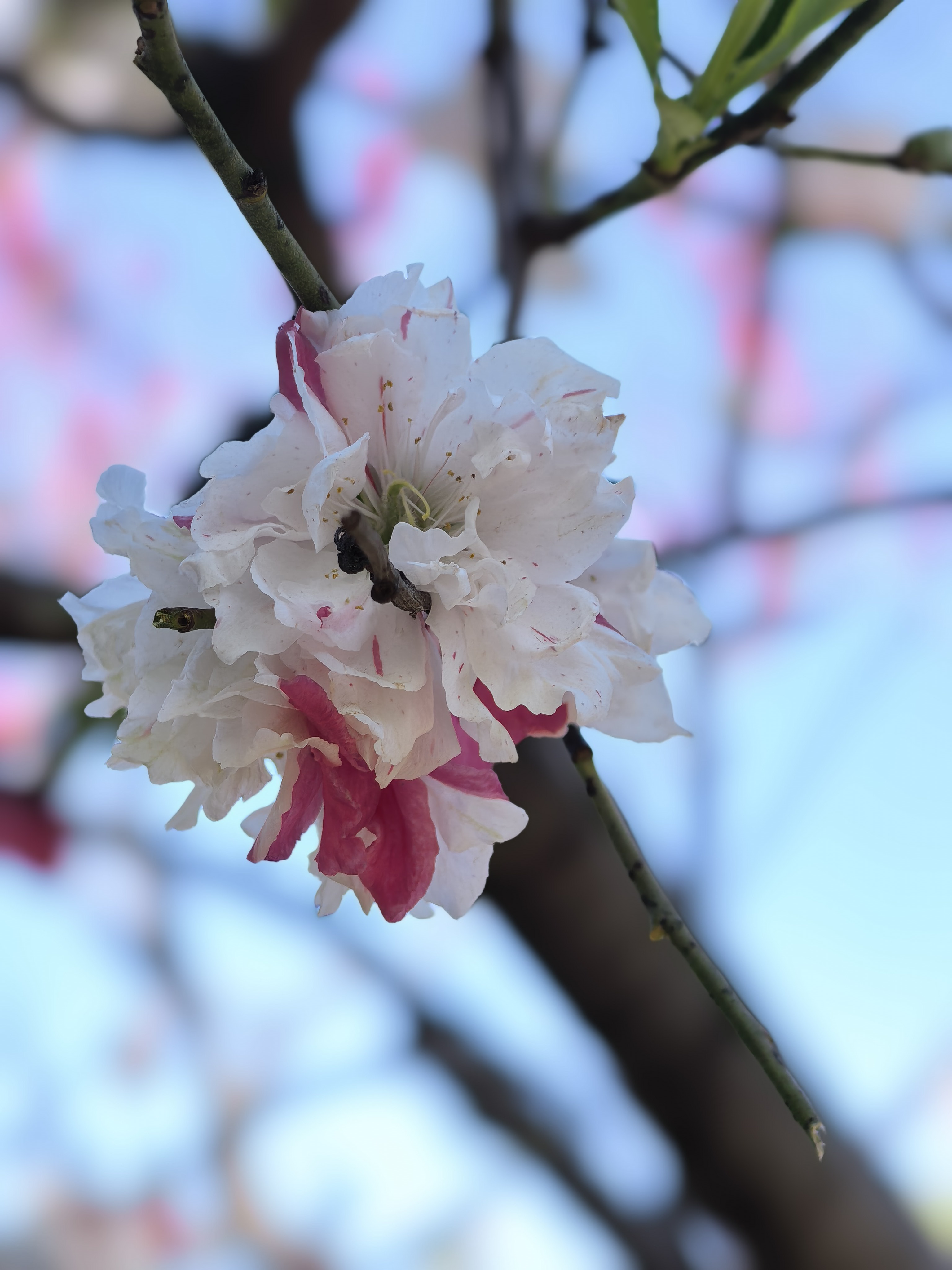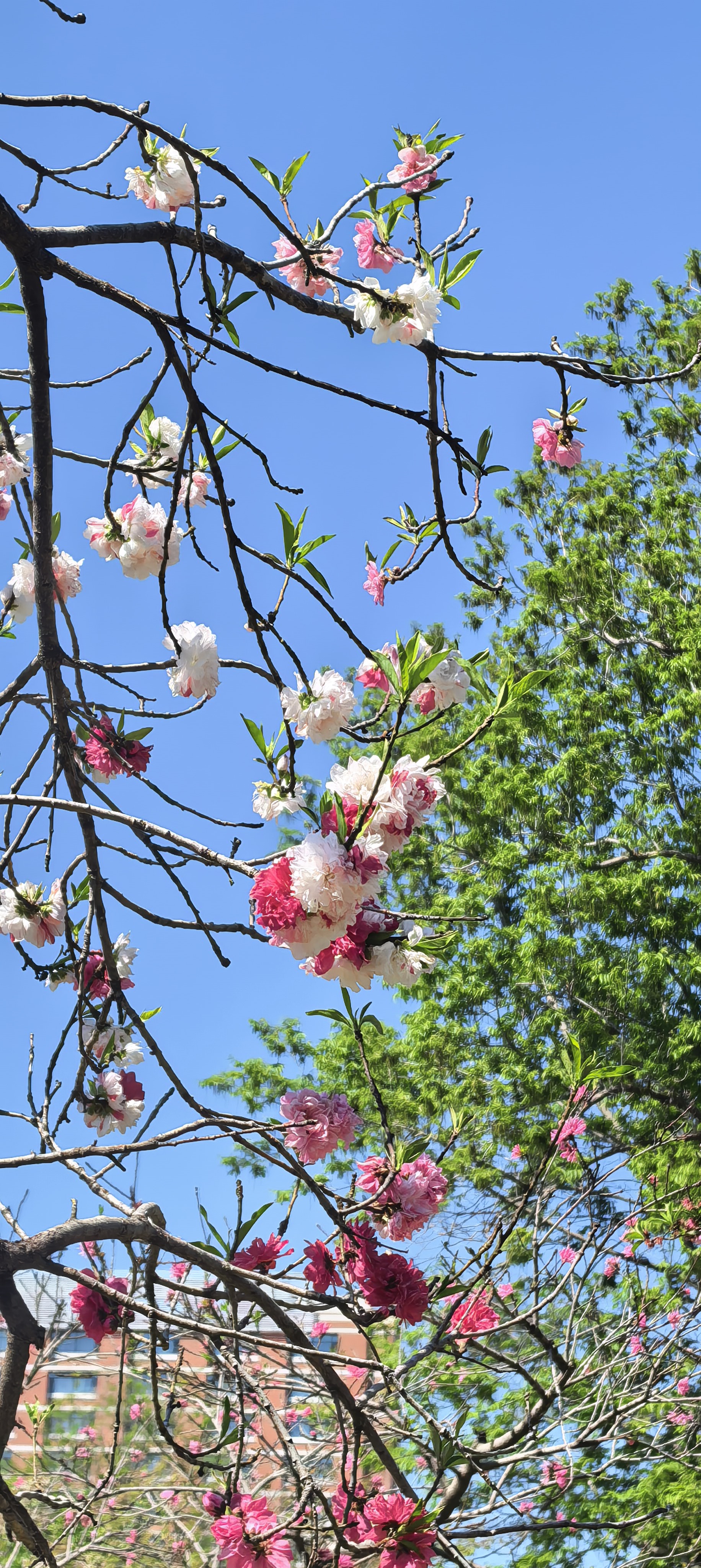 如果你在济南泉城公园遇到一树桃花,有白的,有红的,有粉的,有红白相间的,那便是撒金碧桃花了。