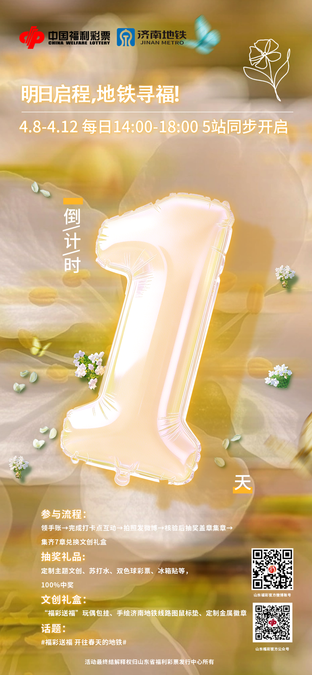 活动期间,发布打卡微博带话题#山东福彩X济南地铁# #福彩送福 开往春天的地铁# #泉城春日漫游#并 @山东福彩,即可参与优质微博评选。