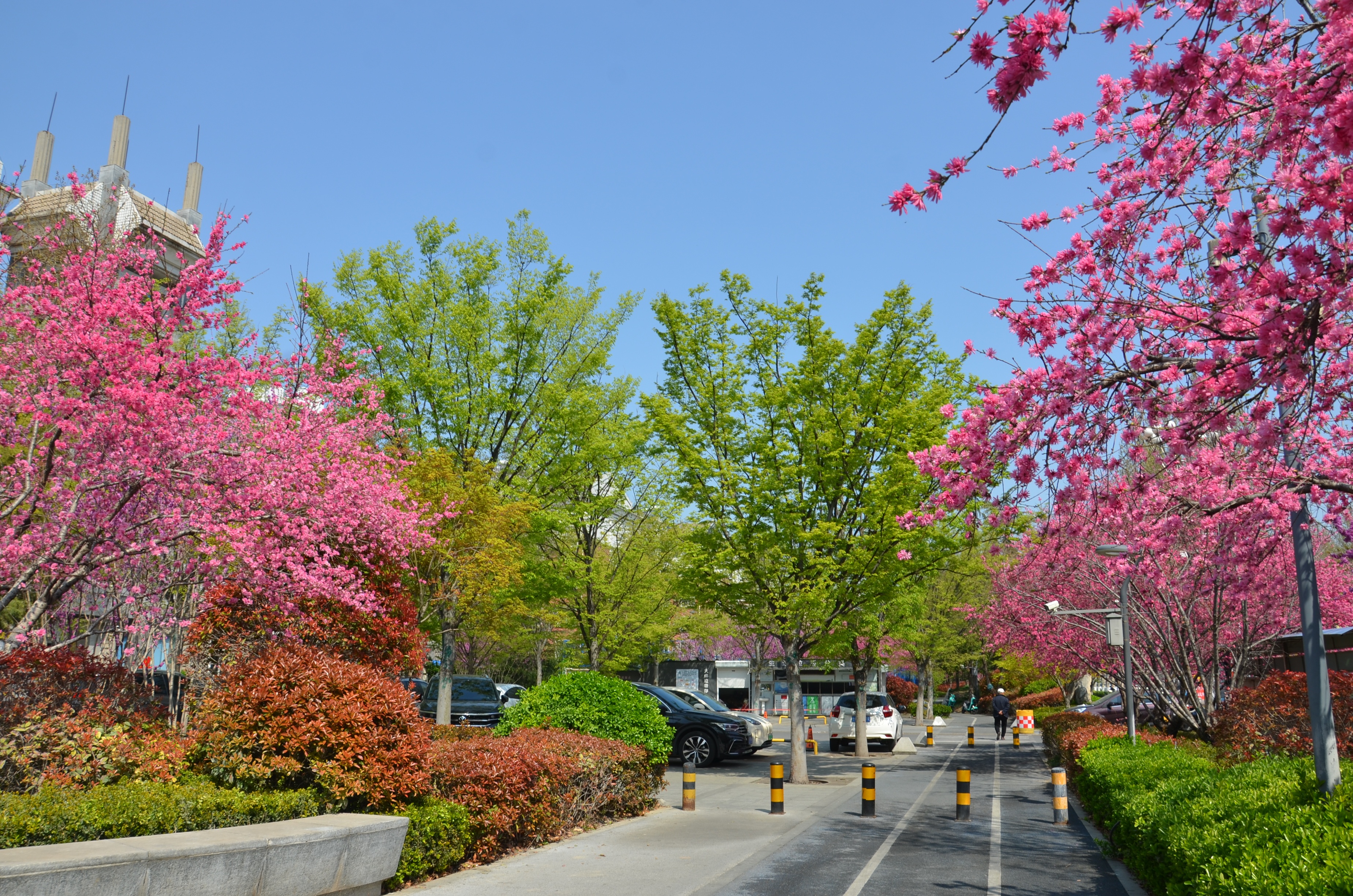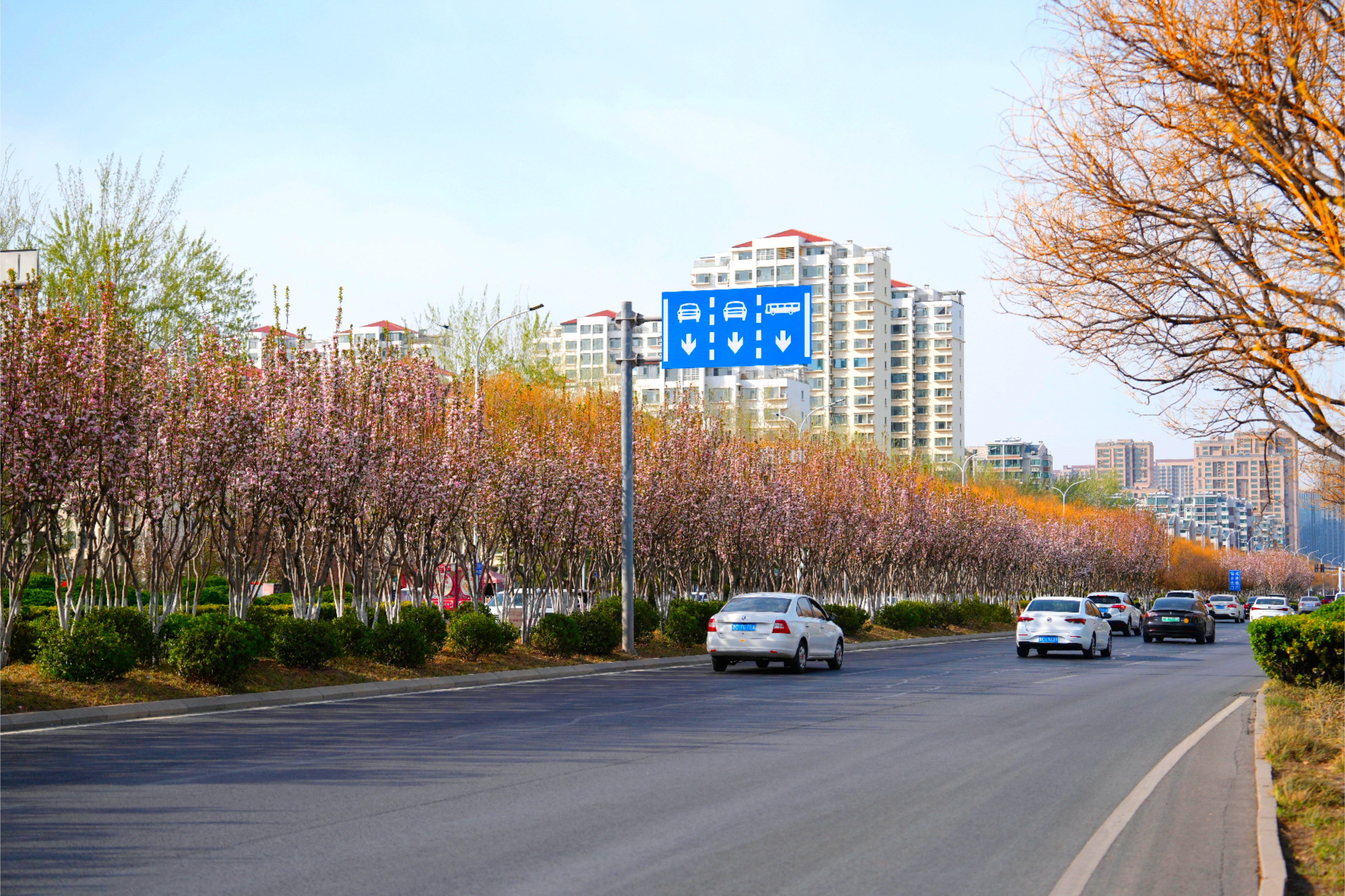 在淄博主城区,中润大道、西五路、联通路、华光路、世纪路等主干道已超越单一的交通功能,演变为四季有花、步移景异的“生态画廊”。三月下旬的淄博,玉兰、连翘、樱花、海棠、紫荆、丁香等花卉相继绽放,粉白、明黄、淡紫等色彩交织如海,共同勾勒出层次丰富的春日景致。其中,华光路以樱花为主题,栽植寒绯樱、染井吉野樱、晚樱等品种,形成“粉雪纷飞”的浪漫景观;人民路以海棠与丁香为特色,花香馥郁,漫步其间宛若置身画境;世纪路的连翘花带绵延数公里,呈现一片金黄,与初绿的垂柳相映成趣,成为市民晨练与摄影的热门地点。