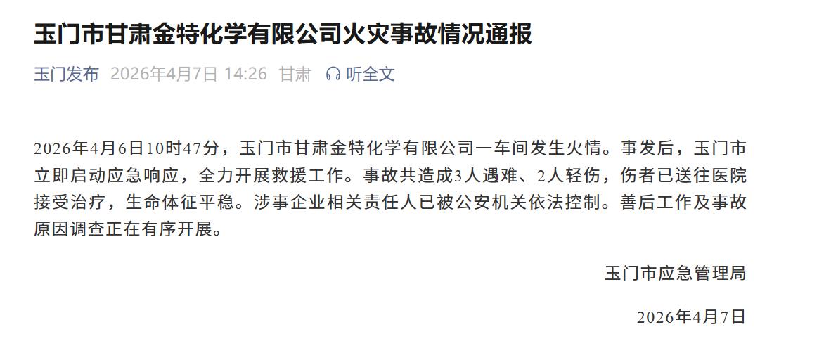 4月7日,记者从玉门市相关部门获悉,4月6日10时40分许,位于甘肃省玉门市化工园区的甘肃金特化学有限公司发生火情,事故共造成3人遇难、2人轻伤,伤者已送往医院接受治疗,生命体征平稳。