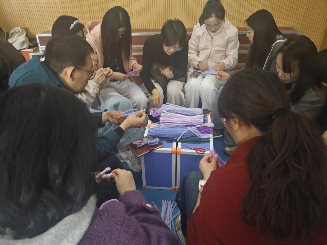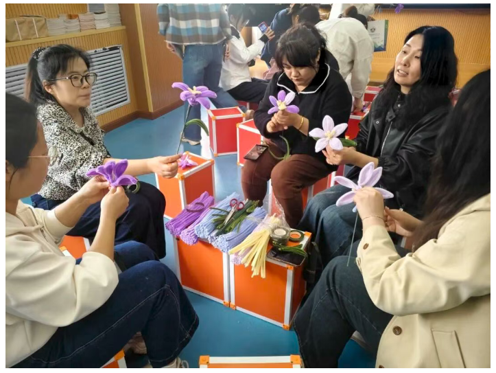 参观结束后,全体教师在音乐教室开展创意手工实践。在美术老师指导下,大家精心制作扭扭棒百合花与创意漆扇,在轻松氛围中舒缓身心、提升动手能力,完成的作品可用于班级美化,为校园环境增添温馨与创意。