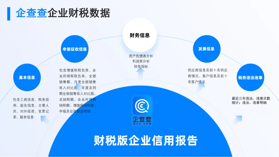 做生意,信息差就是风险差。财税数据是企业最真实的“体检单”,不管你是企业老板、财务、风控、信贷员,还是创业者、投资人,以后谈合作、做尽调、防风险、审资质都可以用企查查一步到位,心里更有底!