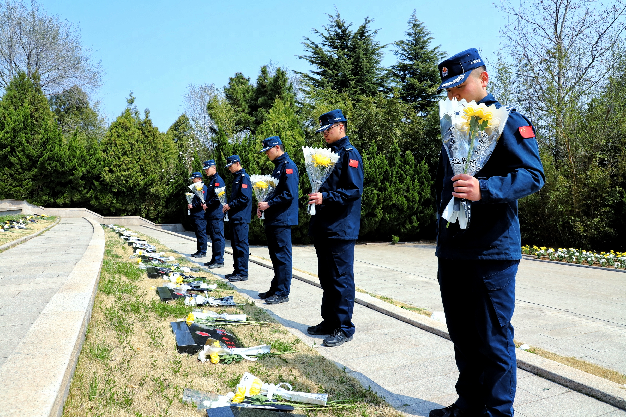清明节期间,为缅怀革命先烈,传承红色基因,威海海警局执法员前往威海市烈士陵园,开展清明祭扫活动,表达对英烈的深切哀思和崇高敬意。