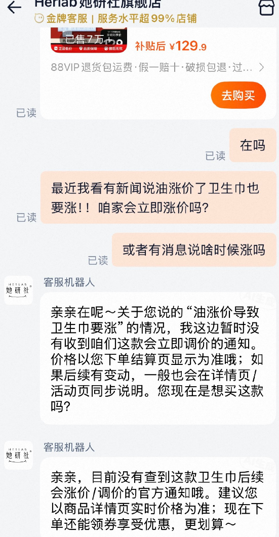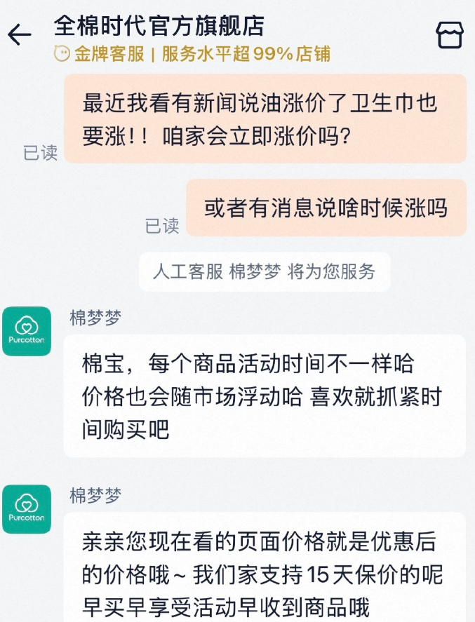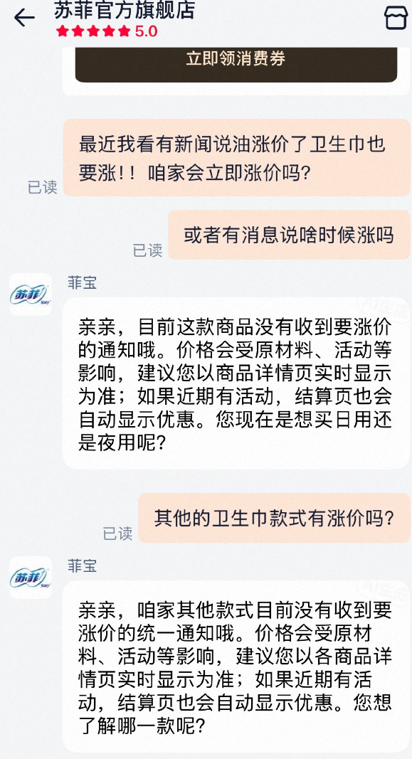 今天,关于油涨价了卫生巾是否会立即涨价的问题,记者以消费者的身份进行咨询高洁丝、全棉时代、她研社、苏菲等卫生巾品牌客服。