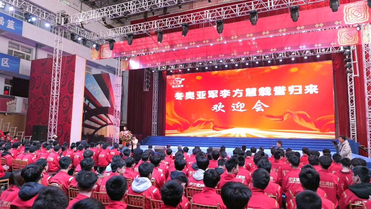 活动现场,宋江武校内喜气洋洋,师生们手持鲜花列队相迎,用此起彼伏的掌声和欢呼声迎接冬奥健儿归来。分享环节中,李方慧回顾了自己从武校基础打磨,到省队、国家队专业历练,再到冬奥赛场从容应战的成长之路,用亲身经历为学弟学妹上了一堂生动的励志课。
