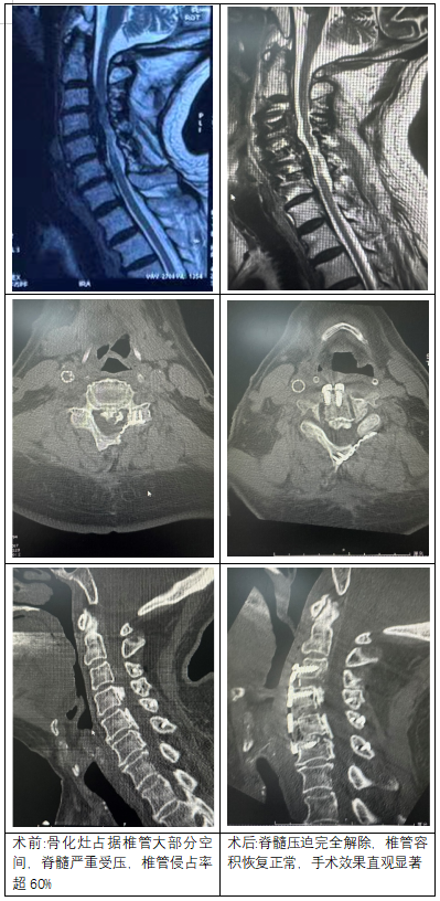 从术前术后影像对比可清晰看到,患者颈椎椎管狭窄部分被充分打开,脊髓压迫完全解除,椎管容积恢复正常,手术效果直观显著。术后患者四肢麻木无力症状即刻缓解,次日便可在支具保护下下床活动,后续恢复状况良好,生活质量得到极大改善。