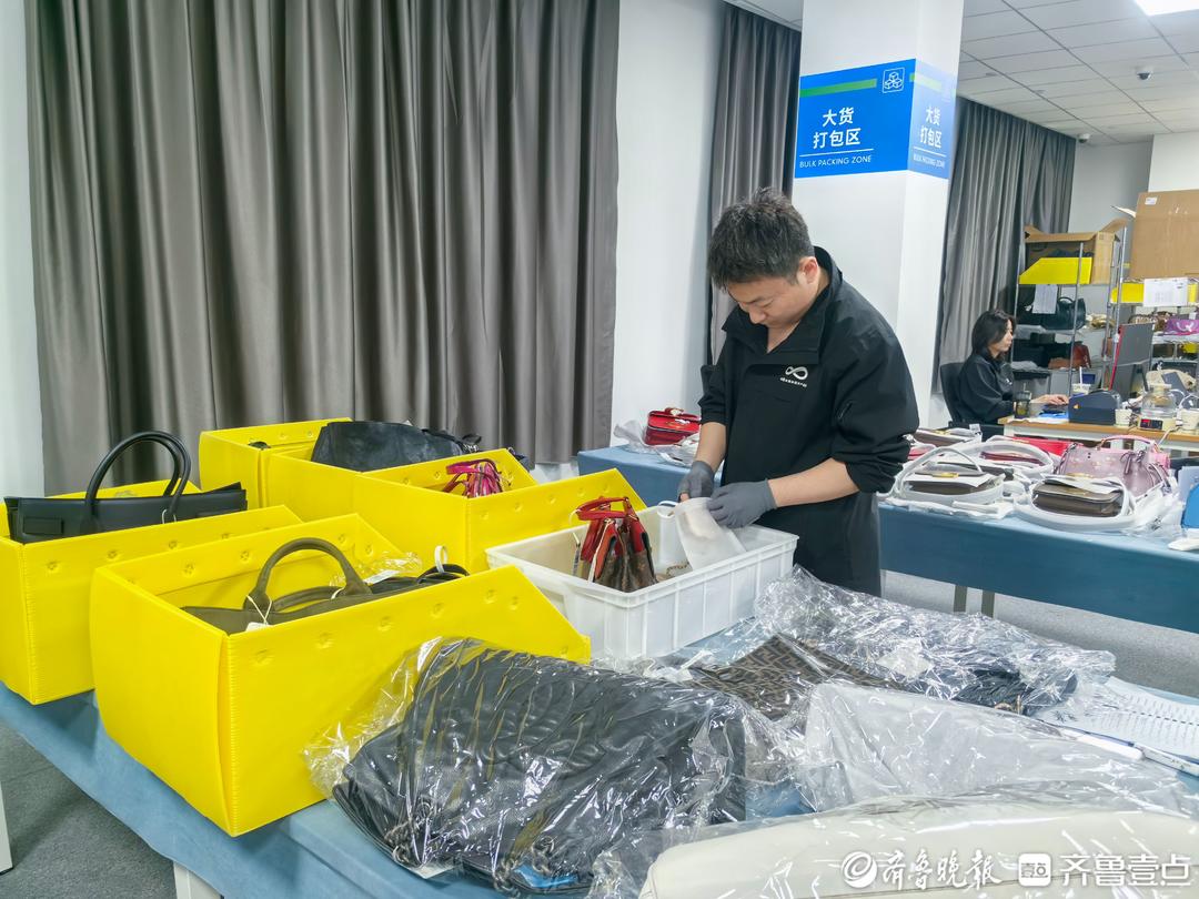最受行业关注的,是出口环节的“卡脖子”难题。在传统模式下,二手品牌箱包报关时极易触发海关知识产权保护执法,因难以取得品牌方授权,容易因确权流程造成滞港,延长跨境时间、增加贸易成本。园区积极探索,在枣庄海关“枣关心”“枫桥经验”工作室的支持指导下,首次在出口“二手品牌箱包”中应用“海关知识产权状况预确认机制”——报关前,园区向海关提交知识产权状况预确认申请及完整货源追溯链,提前对商品知识产权状况进行审核备案。由“通关时查验”变为“通关前主动申报”,2024年7月6日,全国首单经预确认的二手品牌箱包顺利出口美国。截至2026年3月,园区入驻企业已出口二手品牌商品30000余件次,货值超1.5亿元。