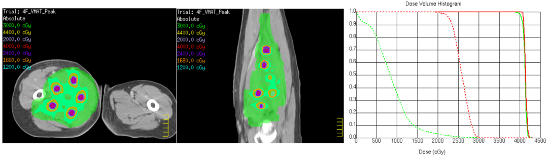 (肿瘤区域在横断位和矢状位上的剂量分布图、DVH图)