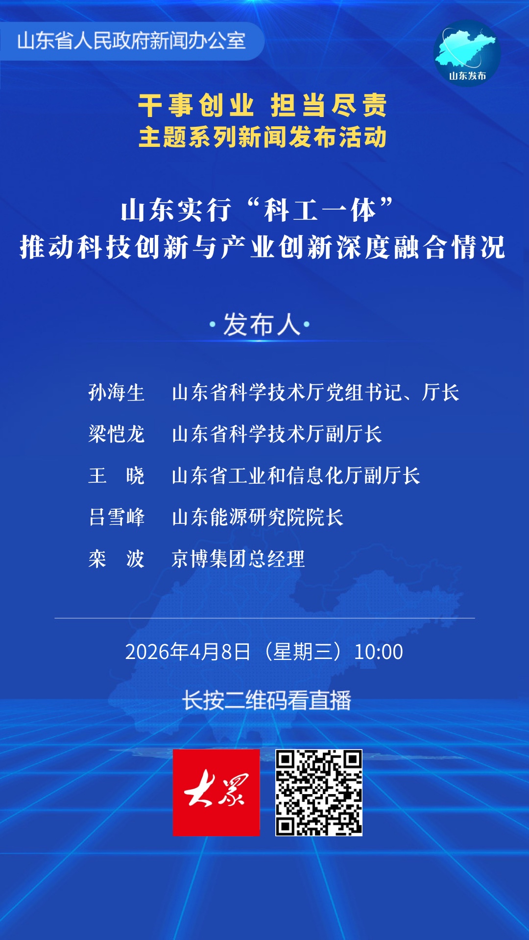 山东省人民政府新闻办公室定于4月8日(周三)上午10:00举行“干事创业担当尽责”主题系列新闻发布活动,邀请省科技厅主要负责同志等介绍山东实行“科工一体”,推动科技创新与产业创新深度融合情况。(大众新闻记者崔晗高广超实习记者朱筱涵李俊雪)