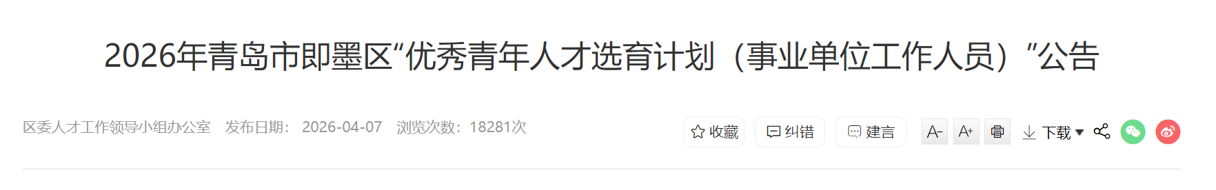 4月7日,即墨区委人才工作领导小组办公室发布《2026年青岛市即墨区“优秀青年人才选育计划(事业单位工作人员)”公告》,本次选聘分为3个岗位,共60人,网上报名时间为4月9日至4月13日。