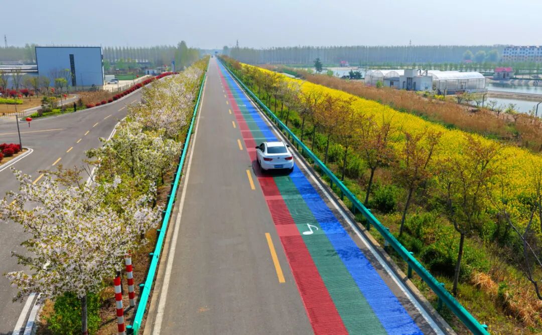 这条音乐公路由济宁市鸿翔公路勘察设计研究院有限公司主持设计,全长550米,路面以红绿蓝三色环保涂装,宛如一条绚丽彩带蜿蜒于微山湖畔,串联起沿途湖畔繁花与湿地风光,打破传统公路单一的交通功能属性,将红色文化、生态自然景观与交通功能深度融合。