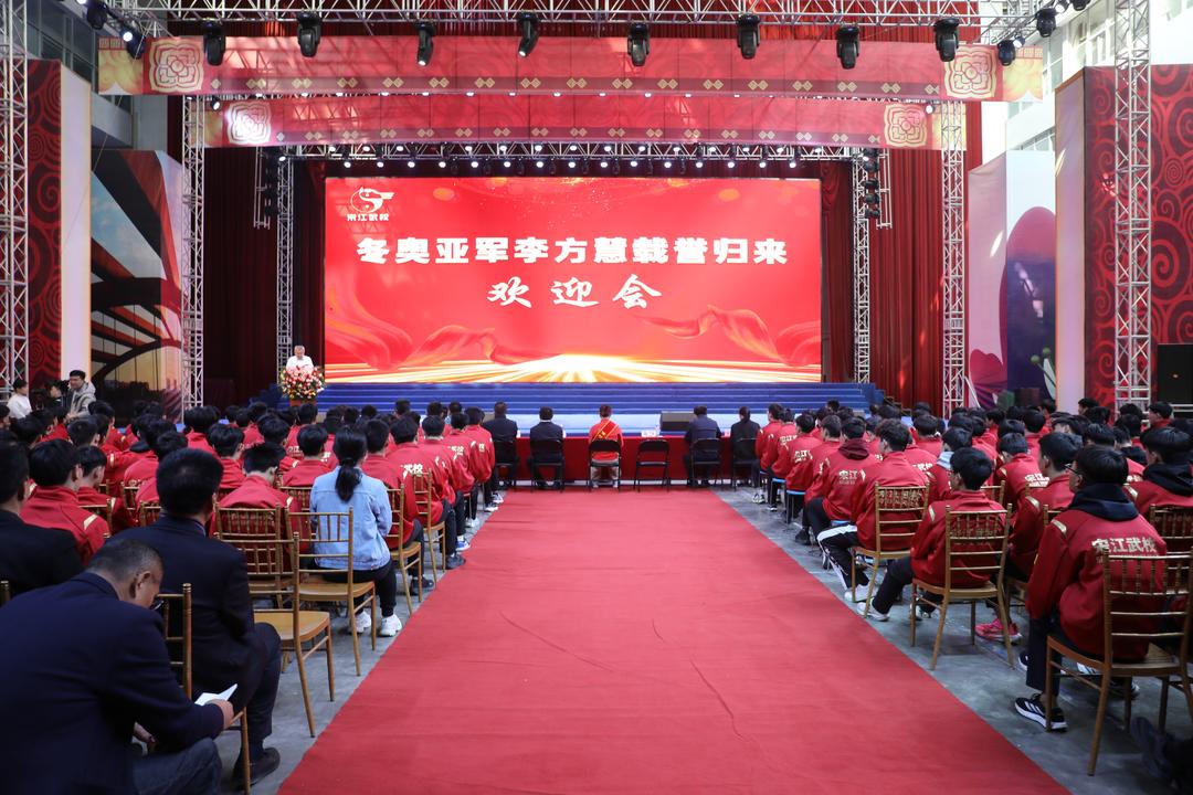 欢迎仪式上,宋江武校校长樊庆斌、副校长刘国庆为李方慧颁发了激励金。李方慧则向母校领导和教练敬献鲜花,表达感恩之情。